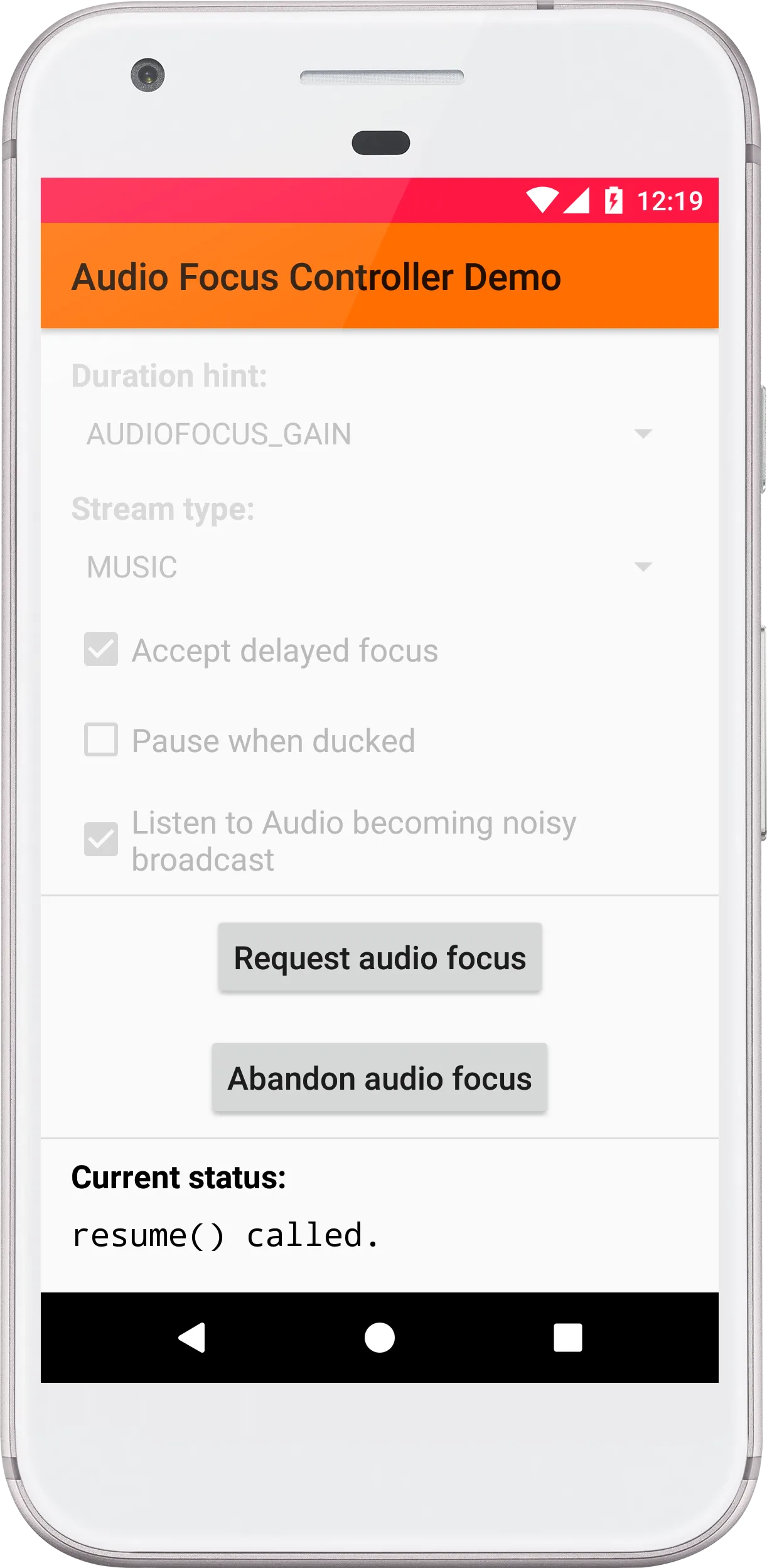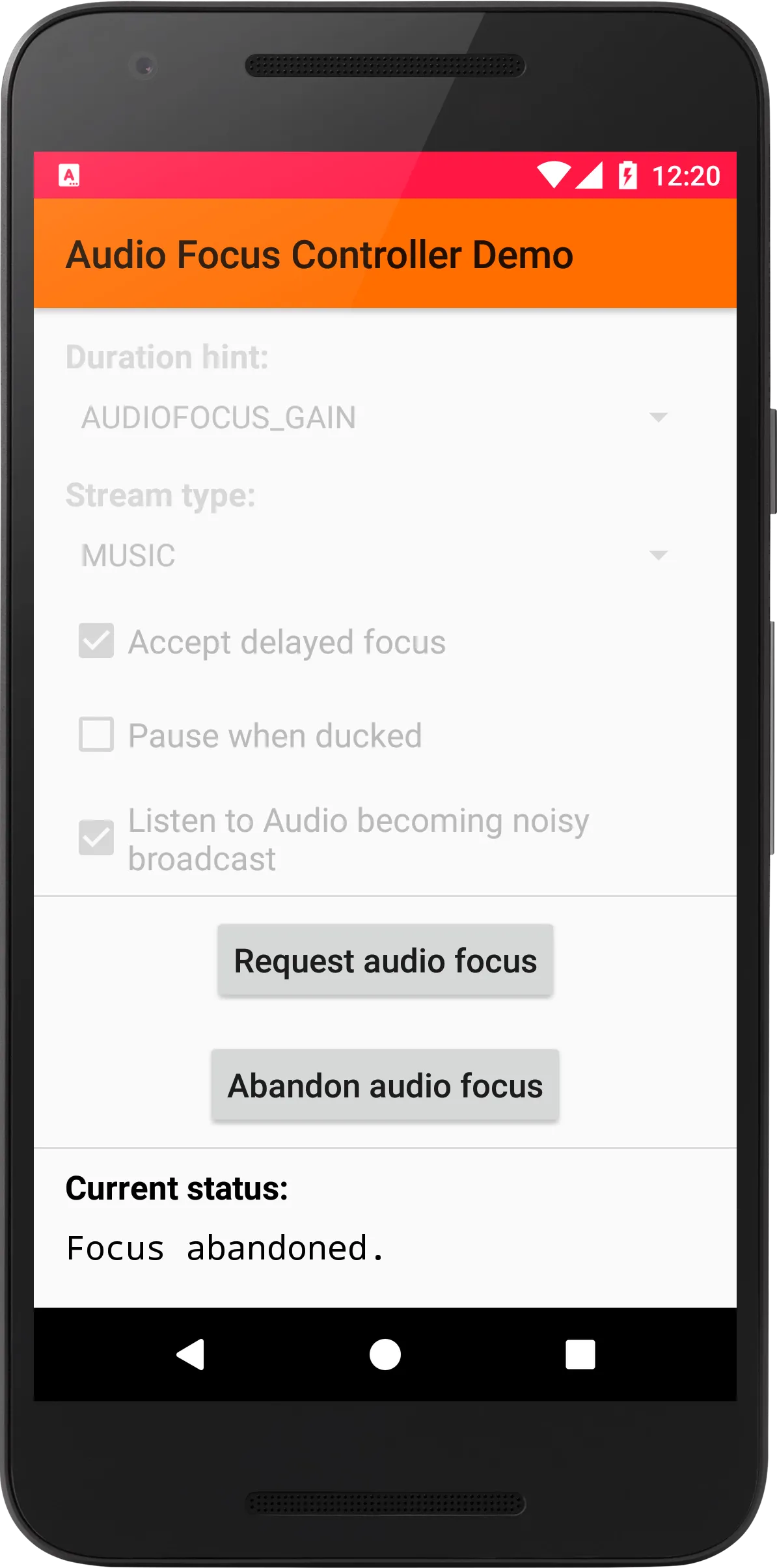 AudioFocusController is an Android library to help you manage Audio Focus in your app with minimal code. This app that not only demonstrates how to use the library, but is also helpful in testing whether your app behaves correctly if it loses audio focus. For more details, please visit https://github.com/WrichikBasu/AudioFocusController