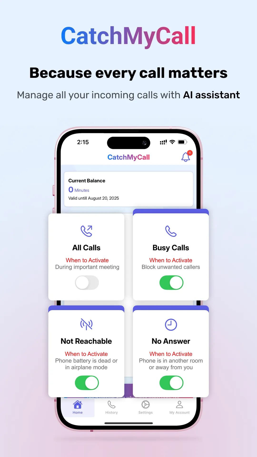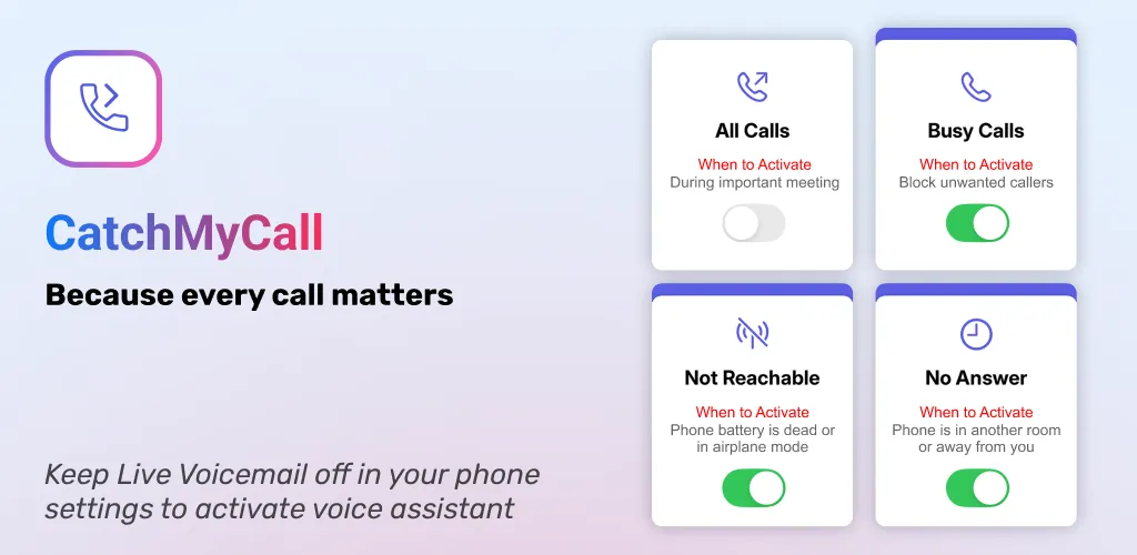 π± CatchMyCall AI [ Auto Answer & Missed Call Manager ] Never miss important calls again. Let AI handle calls when you're busy, traveling, or out of network. CatchMyCall is your personal AI call assistant app that answers, records, and manages calls automatically β like a virtual receptionist always available for you. ...
