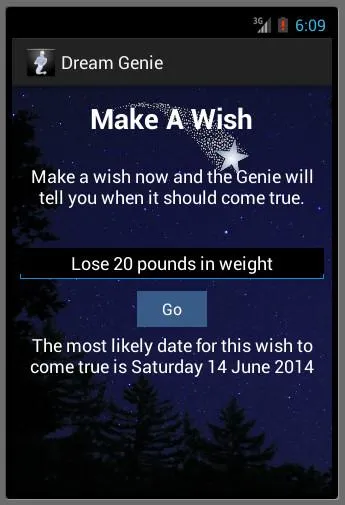 Please read the full description before downloading or rating this app. Ever made a wish but it didn't come true? Maybe your wish would have come true but you missed it. Make a wish and the Dream Genie's Make a Wish app will tell you a possible date for your wish to come true. When you know the date you can look for the signs on the correct day and you are more likely to get the result you desire. ...