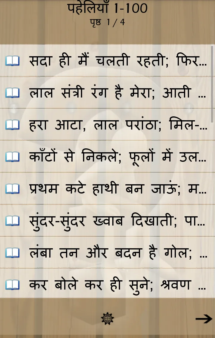 For all the fans of Hindi puzzles and riddles here are hundreds of riddles or paheliya that you can enjoy with. Hindi Riddles (हिंदी पहेलियाँ) app contains hundreds of Hindi Riddles [हिंदी पहेलियाँ] with answer in hidden mode. Hit the “Uttar dekhen” button to see the answer. Share riddles with friends on various social networks like whatsapp, wechat, facebook. Hundreds of fun hindi riddles (हिंदी पहेलियाँ) in this Hindi Paheliyan app which provides you hours of brain-teasing fun. Good luck! ...
