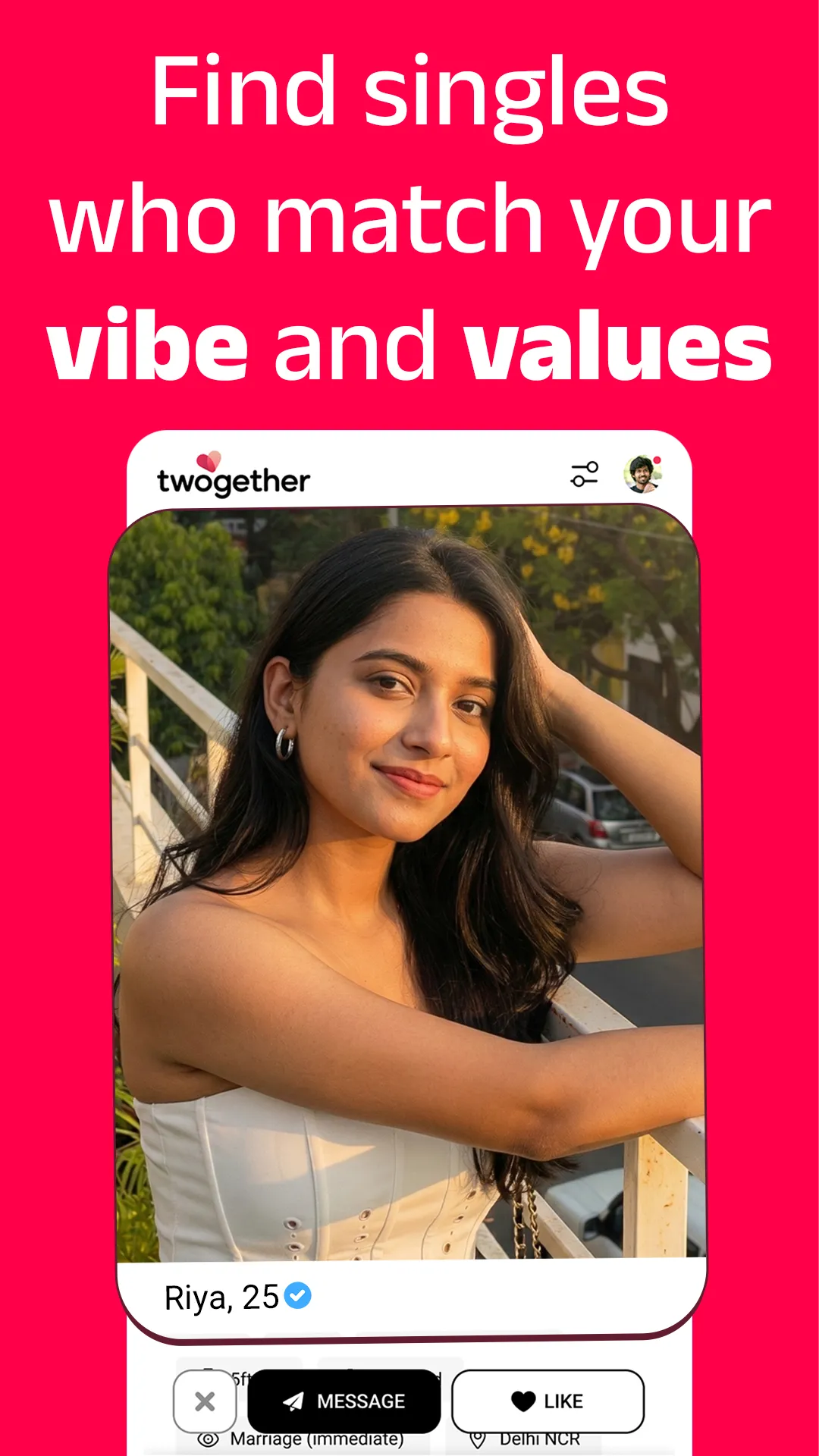 Twogether is a leading matrimony app in India designed to help you find compatible partners for a serious relationship. You can easily chat, connect and meet suitable singles who fit exactly to your marriage wish-list. With our best matchmaking system and latest algorithm, we ensure that you always encounter fully verified and genuine singles for marriage. Our app has transformed the Indian marriage scenario with lakhs of users finding their right companion for marriage. Endless matches to explore! With new profiles added daily on our matchmaking app, you will never compromise on your preferences. Select from a wide variety of matrimony profiles from India and stand a chance to find your forever. You can find companions from different communities or religion such as Hindu, Muslim, Christian, Buddhist, Parsi, Sikh, Jain, Atheist or any other. Not just this, you can select your matches from any Indian top cities including Hyderabad, Bangalore, Chennai, Mumbai, Pune, Delhi, Kolkata, Ahmedabad, Chandigarh etc. Game changing filters for accurate results To find a matrimony profile that matches your mother tongue, you can directly implement language filters to choose from numerous languages such as Telugu, Marathi, Gujarati, Tamil, Hindi, Bengali, Kannada, Malayalam and more. Mention any specific criteria during your marriage search to make the process smoother and you are ready to view your matches by age, height, current status, background or values. We have already connected matches based on similar life priorities, mind-set and goals and we can help you find the same. Personalized matching like never before...