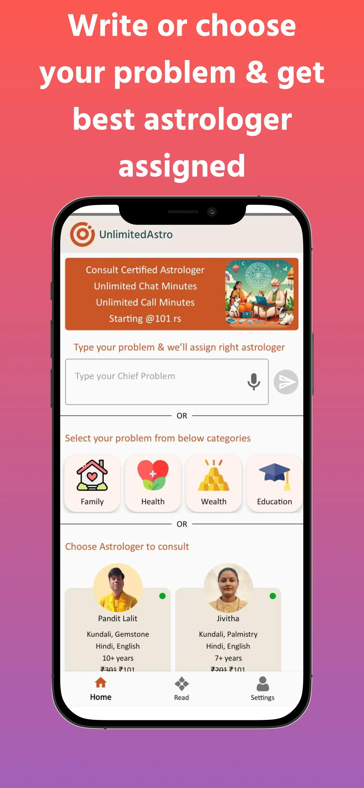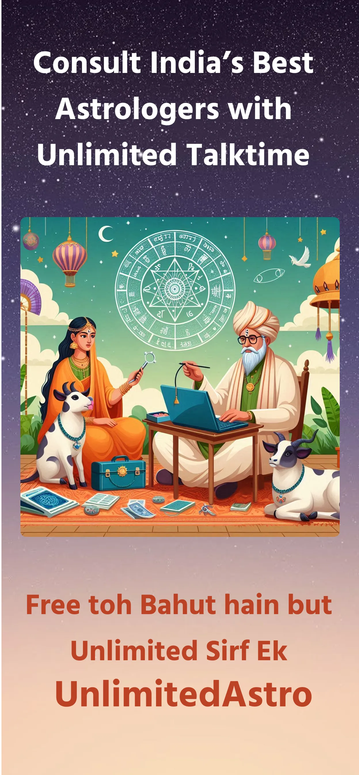 Welcome to UnlimitedAstro, the ultimate destination for personalized astrological guidance! 🌟 With unlimited talk time and access to genuine, knowledgeable astrologers, we’re here to help you find clarity and solutions to life’s challenges—be it relationships, career, health, or personal growth. At UnlimitedAstro, we’re on a mission to redefine astrology by offering authentic, personalized guidance from expert astrologers who truly care about your well-being. Say goodbye to misleading advice and rushed consultations! Key Features: ...