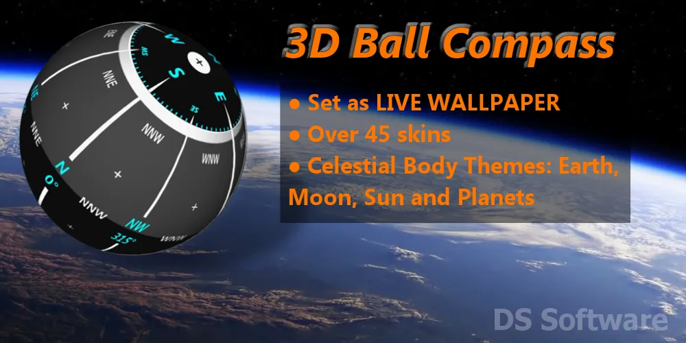 Beautiful skinnable Three-D globe compass. Set any compass as your LIVE WALLPAPER on compatible devices. Features: ● Beautifully rendered 3D compasses with Earth, Moon and Planetary themes. ● Easy to read in any orientation. ● Digital magnetic compass readout. ● Gyroscope assistance on compatible devices provides an accurate, super fast response.