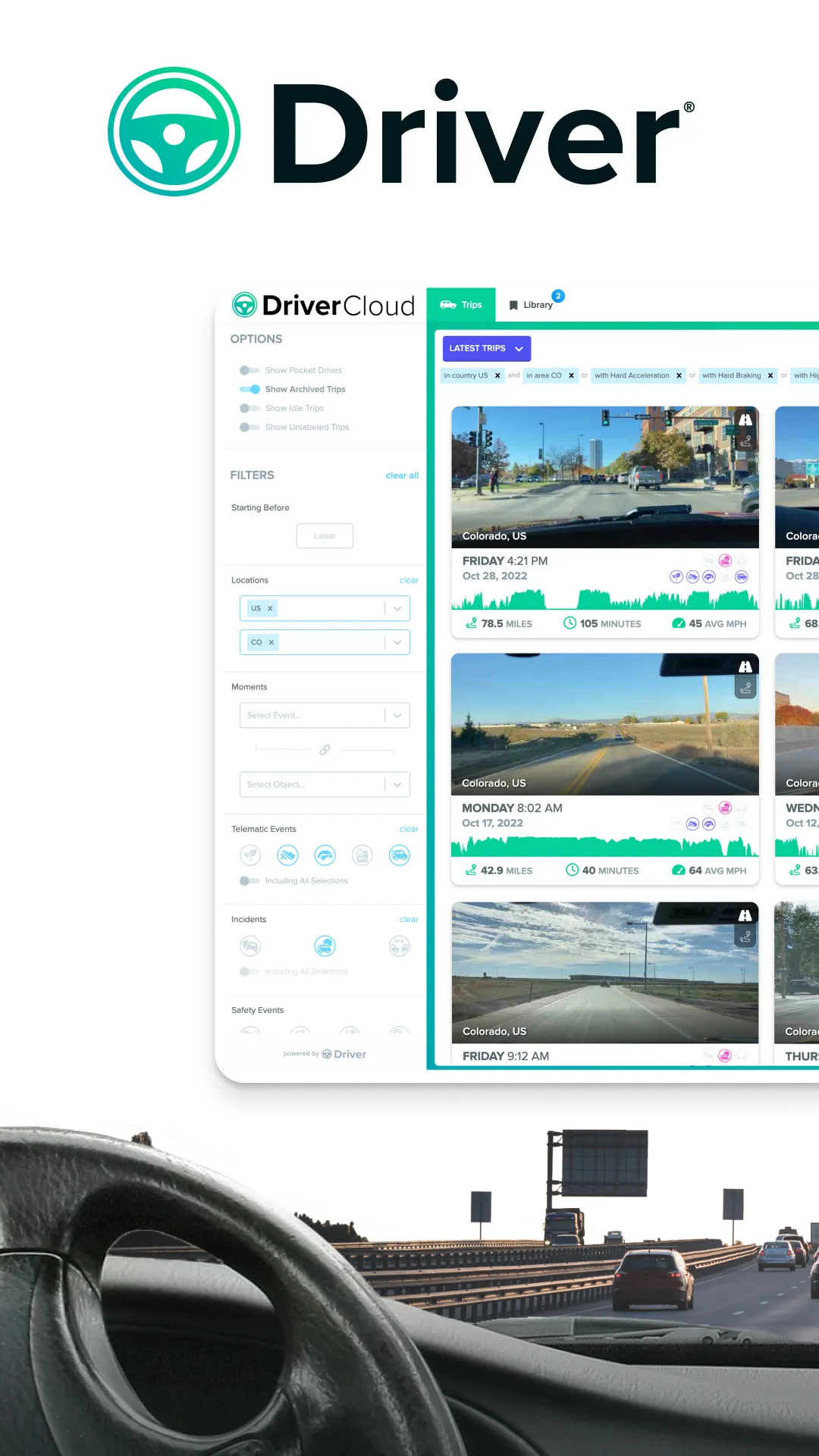 Driver offers a fully connected driving experience through our Cloud + App platform, covering liability protection, roadside services, claims assistance, driver education, legal and vehicle support, partner deals, and more. The Driver App is available on both Android Automotive and mobile devices. The Driver App has two primary modes for liability protection: 1) Telematics 2) Dash Cam. On Android Automotive, Driver automatically collects precise Telematics data directly from your vehicle, e.g. mileage, location, speed, G-force, etc. Pair your trip’s vehicle data with video recordings by using the Driver App on your mobile device, which turns your phone into a dash cam. Both Telematics and Dash Cam are automatically uploaded to the Driver Cloud for easy viewing and management across any browser or mobile device. Sharing a trip with your insurance, boss, or family is as easy as sending a URL link to your trip on the Driver Cloud. ...