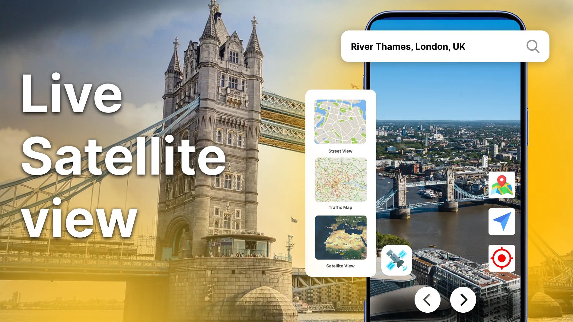 Discover the world from your pocket with Live Earth Map: Satellite View Explore, navigate, and discover easily using smart GPS navigation and real-time satellite map views. See the real-time street view using live cams, traffic and live weather updates of any location. See the world differently, your global journey begins here. 🌐 Live Earth Map Satellite View 🛰️ ✔ Zoom into any region with live earth map satellite imaging. Perfect for virtual tours or global discovery. ✔ See Earth from a new perspective with real-time satellite visuals....