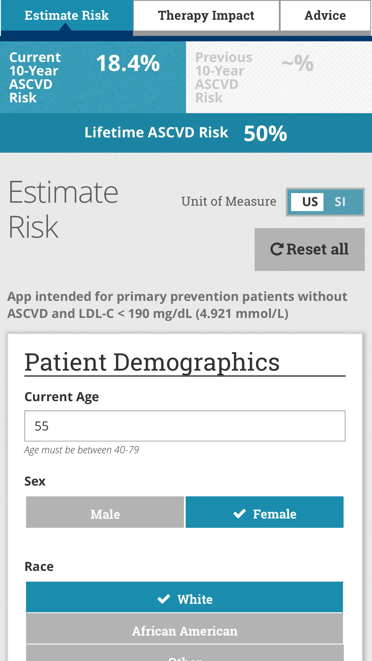 The updated ASCVD Risk Estimator Plus uses up to date science and user feedback to help a clinician and patient build a customized risk lowering plan by estimating and monitoring change in 10-year ASCVD risk. Use the app to: • Estimate a patient’s initial 10-year ASCVD risk using the pooled cohort equation • Receive an individualized, risk-based, intervention approach ...