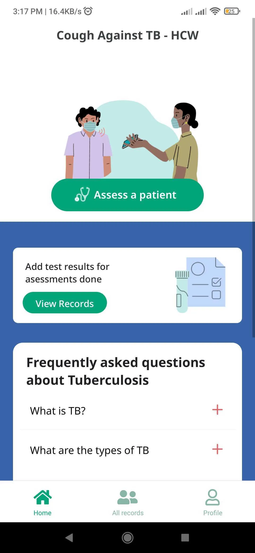 This app is an AI-enabled screening tool developed by Wadhwani AI, in collaboration with the Central TB Division (CTD), to assist Healthcare Workers in identifying individuals who may have Pulmonary Tuberculosis (TB). Using solicited cough sounds, symptoms, and comorbidity information, the app provides a non-invasive, point-of-care screening method. Important: This is a screening tool only. It does not provide a medical diagnosis. Users flagged as ‘presumptive TB’ should undergo further confirma...
