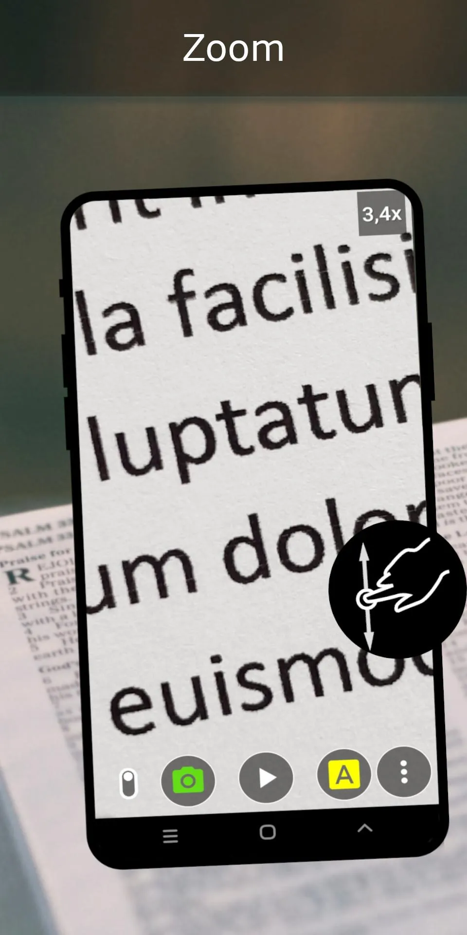 weZoom inst is a camera-based magnifying glass to zoom in on things around you. As a low vision aid it extends the functionality and accessibility of basic magnifying glass apps by adding color filter modes, themes, intuitive gesture control and one-hand operation. The main goal of this app is to support people with visual impairments by providing an easy to use digital magnifier. The main features are: • Color filter modes for high contrast (black-white, black-yellow, blue-white, blue-yellow, black-green)...