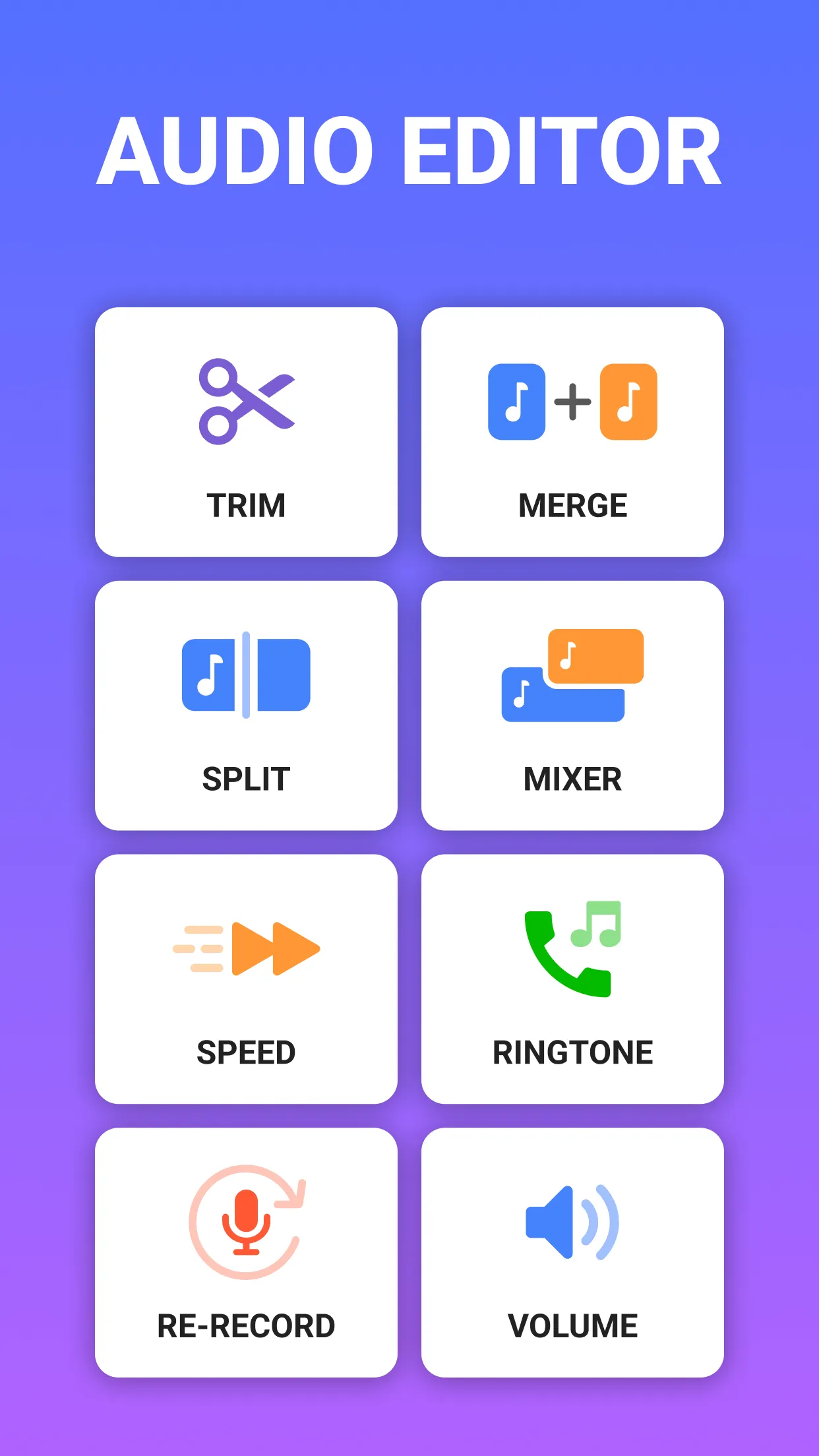 Introducing Music Audio Editor, the ultimate audio editing app for your mobile device. Easily create custom ringtones or merge sounds with our sound and audio editor. Edit songs or cut music with music editor free. All in one convenient app: trim, merge, mix, ringtone, volume and re-record. Our music editing app offers a variety of powerful features to enhance your audio files. With the audio trimmer and mp3 cutter, you can easily cut music and edit music with precision. The song editor allows you to adjust the volume, add fade-in and fade-out effects, and apply various audio filters such as echo, reverb, and distortion. ✂️Sound trimmer✂️ The mp3 cutter feature allows you to select a specific section of a song and edit it to your liking. With a music editor, you can also merge sounds to create unique audio tracks. Whether you want to create a custom ringtone or edit music for a video project, our app has got you covered....