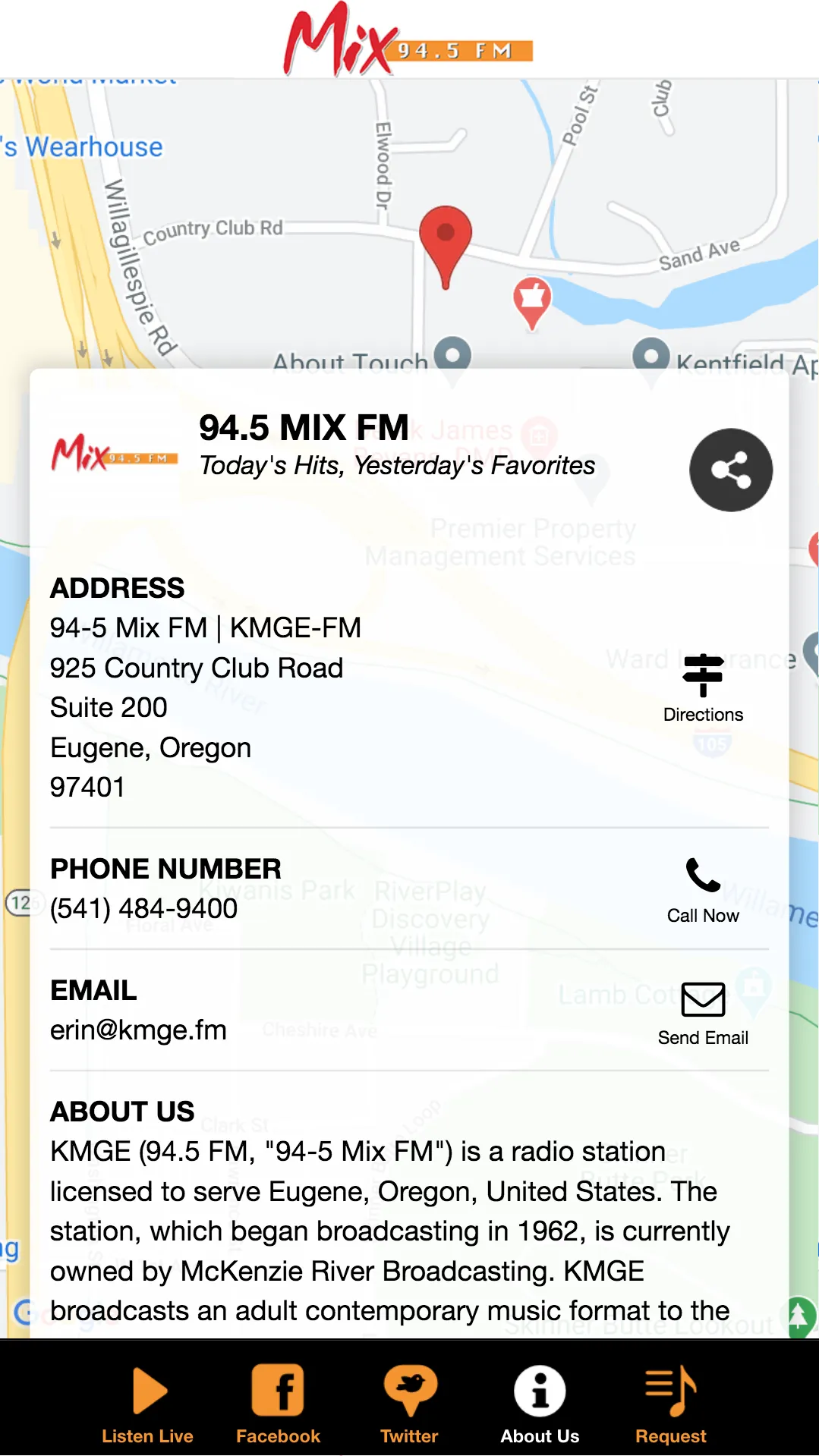 KMGE (94.5 FM, "94-5 Mix FM") is a radio station licensed to serve Eugene, Oregon, United States. The station, which began broadcasting in 1962, is currently owned by McKenzie River Broadcasting. KMGE broadcasts an adult contemporary music format to the Eugene-Springfield, Oregon, area.
