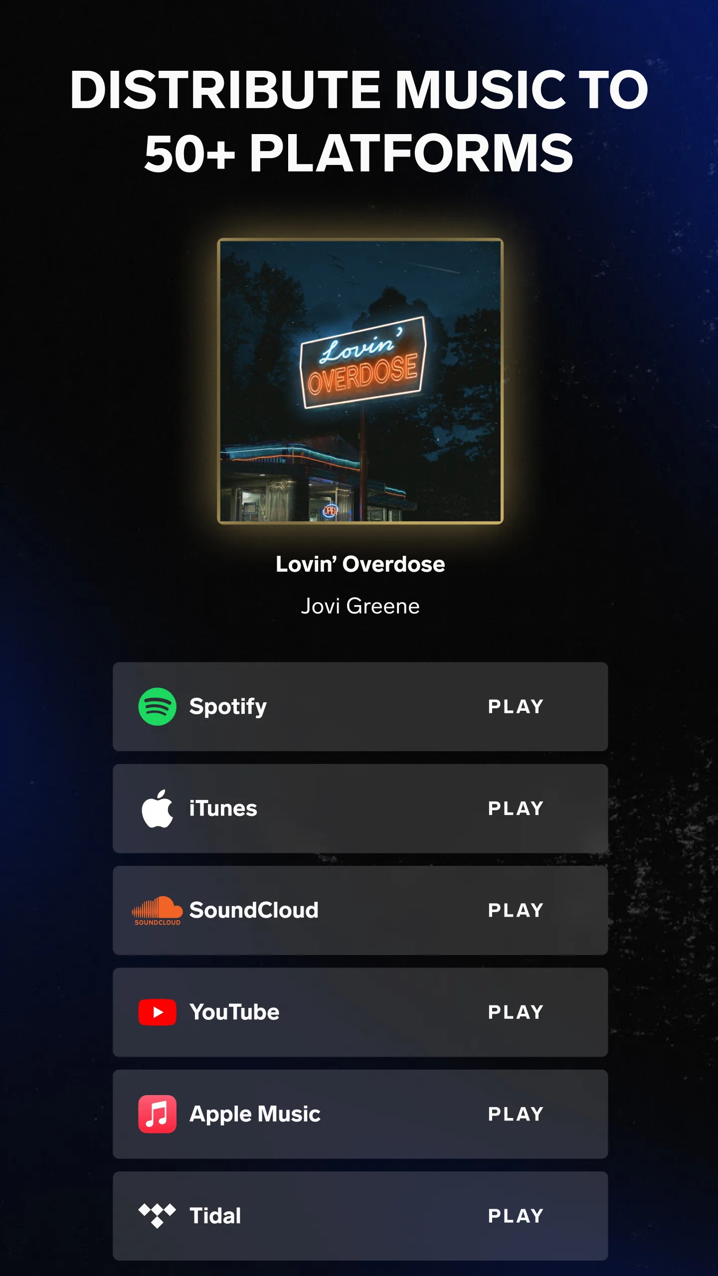 MUSIC DISTRIBUTION APP FOR INDEPENDENT ARTISTS Distribute music, master your audio tracks, discover trending beats, & grow your fanbase - all while keeping 100% of your masters. Sell your music online & distribute your songs across 50+ music streaming services such as Spotify, Apple Music, SoundCloud, & YouTube Music. Track your growth with our advanced analytics & access exclusive brand deals to elevate your music career. ...