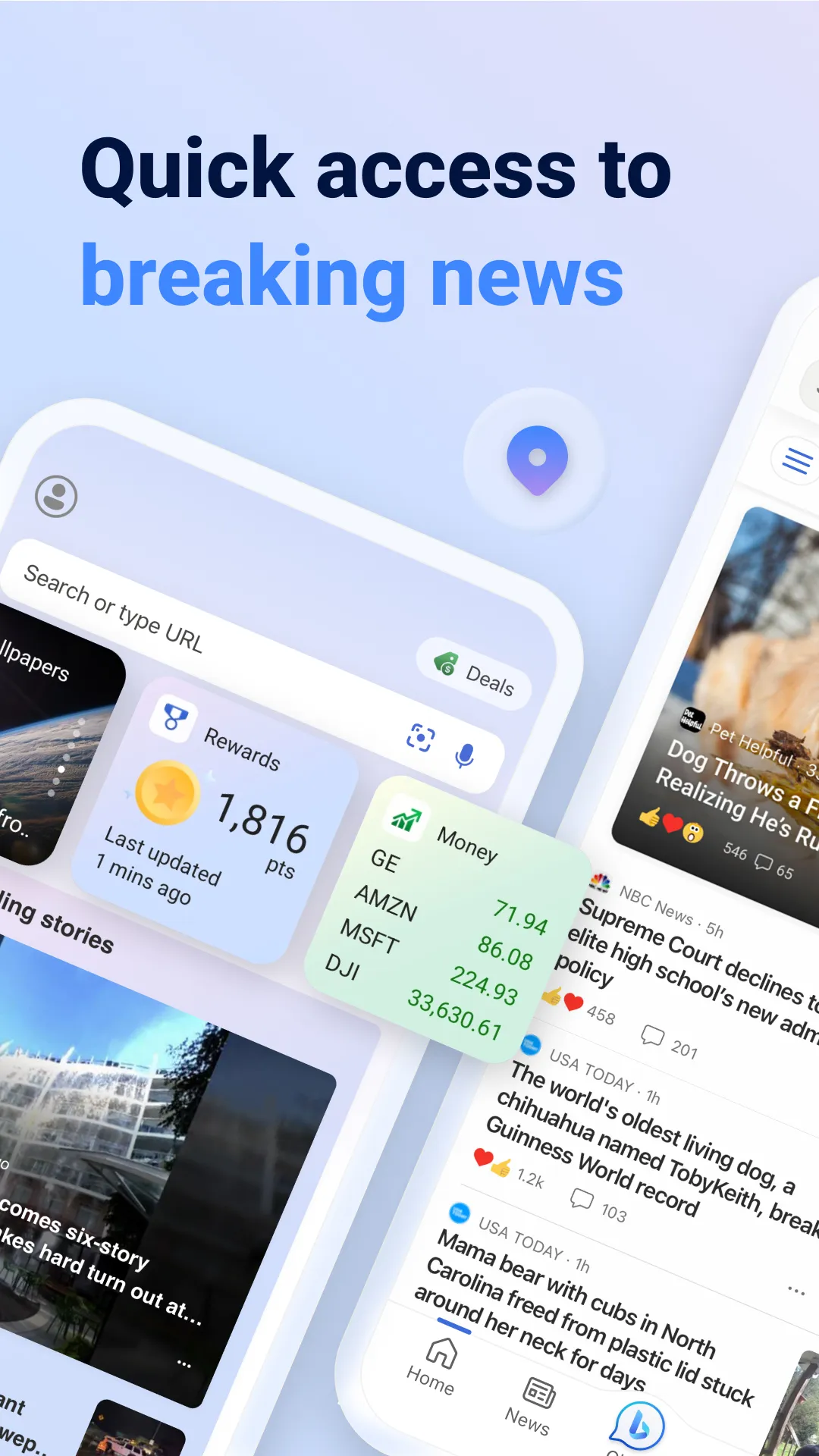 Stay organized and productive with all your daily activities such as News, Rewards and more. Personalize your news feed and stay connected with the latest entertainment, sports, tech and science, lifestyles—even health and fitness trends. Play games, browse wallpapers, find shopping deals, and earn Microsoft Rewards. Want to discover more with Microsoft Start? Install it now! *Functions mentioned above not available in all markets, actual features and display contents may vary. Key features Connect with breaking world, national, and local news ...