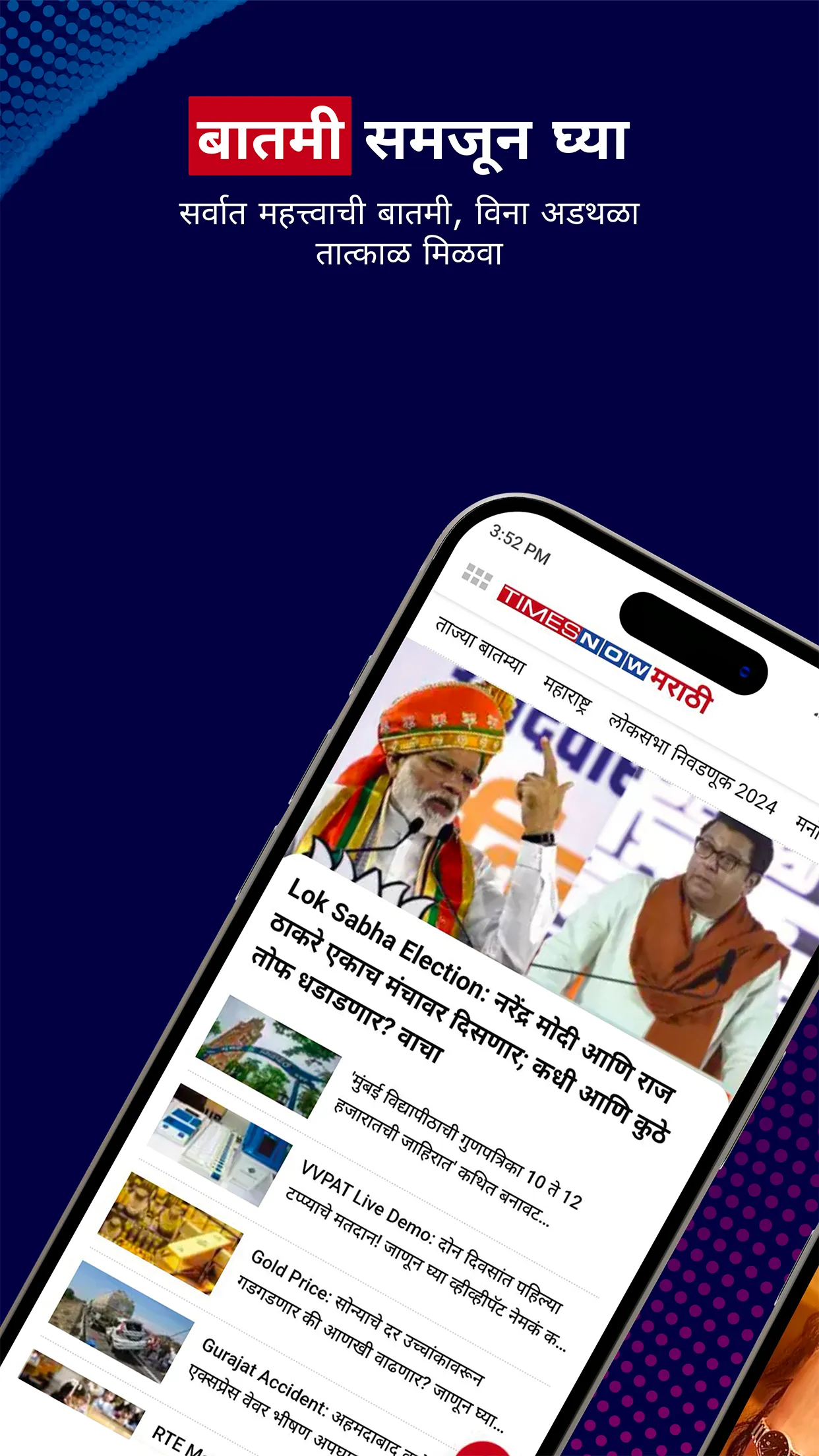 Get the Latest News in Marathi from the Times Now Marathi app ( टाईम्स नाऊ मराठी ॲप), your go-to source for the Marathi Batmya (ताज्या मराठी बातम्या), and the breaking news from Maharashtra, (महाराष्ट्राच्या बातम्या) India, and across the Globe. Experience real-time updates, news alerts, and in-depth coverage of top stories in Marathi (मराठी बातम्या). Whether it's politics, entertainment, sports, lifestyle, Health, astrology, horoscope, or local events, Our comprehensive app ensures you never miss a beat of trending news, providing access to today's breaking news, live updates (लाइव्ह न्यूज अपडेट), and exclusive stories in Marathi (मराठीतील ताज्या घडामोडी), tailored just for you. Times Now Marathi App, offers Marathi Horoscope, Rashifal (आजचे राशीभविष्य), Marathi Recipes, News Photos, News Videos, Quiz and Comics in Marathi. Times Now Marathi ( टाईम्स नाऊ मराठी) is the top destination for news in Marathi, providing authoritative, authentic, and analytical content. As the leading news provider in India in Marathi, our goal is to provide comprehensive, compelling, and classy content that shapes the opinions of tomorrow. Key Features of the App: - Latest local news in Marathi from Maharashtra (महाराष्ट्राच्या बातम्या) and all districts. ...