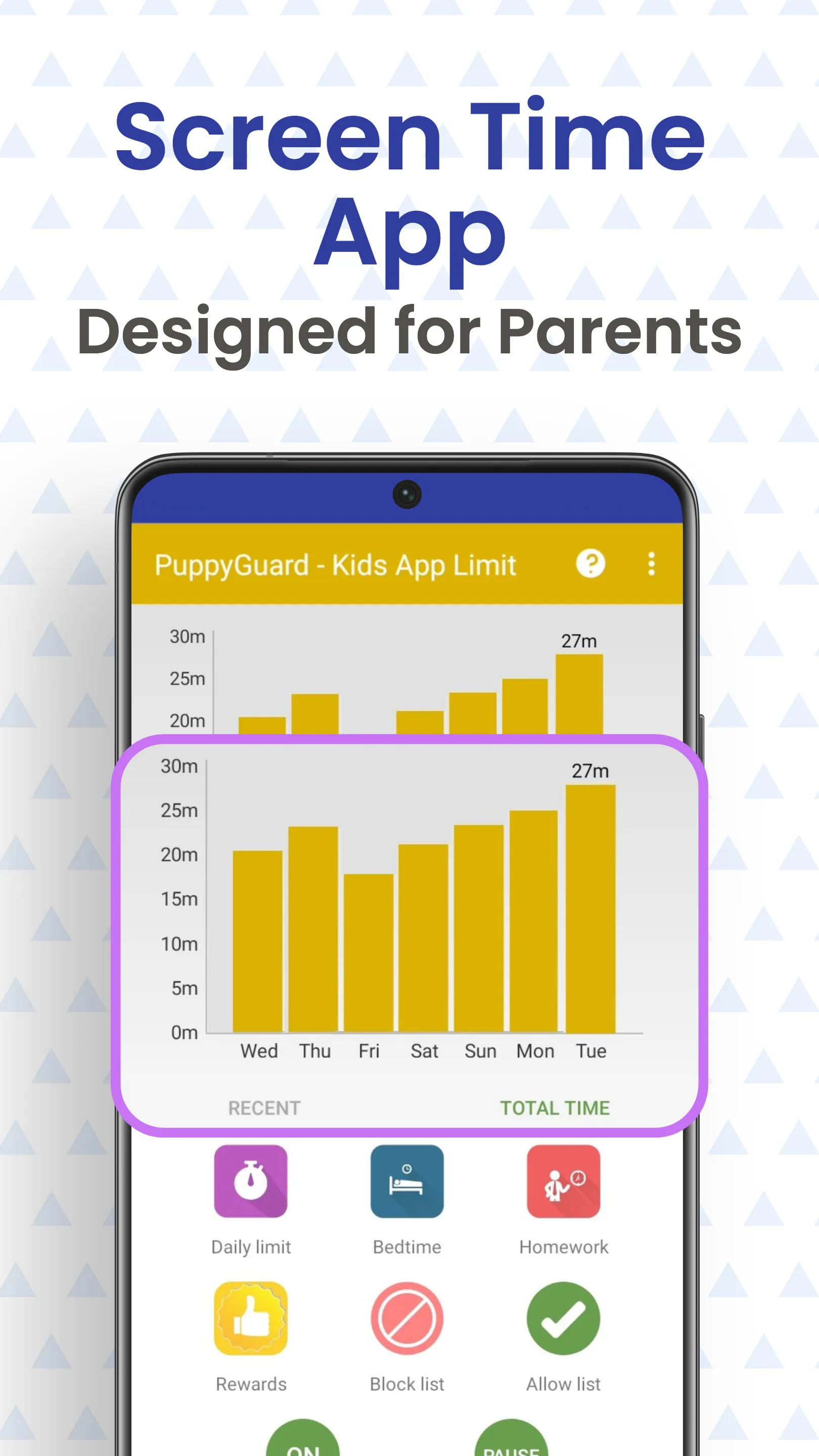 PuppyGuard is a free, easy-to-use screen time management app for Android that helps parents control how and when their kids use their devices. With powerful tools like daily screen time limits, app-specific time controls, scheduled app blocking, usage reports, and reward-based access to games, PuppyGuard makes it simple to reduce distractions, encourage learning, and build healthy digital habits. Whether you want to block certain apps, allow only educational tools, or set break reminders to protect your child’s eyes, PuppyGuard puts you in full control—all protected with a secure PIN. 🛡️ Key Features ⏱️ Set Daily & Scheduled Screen Time Limits Create healthy routines by setting daily screen time limits. You can also schedule usage-free hours (like during homework time or bedtime) when most apps are automatically blocked to promote better focus and rest. ...