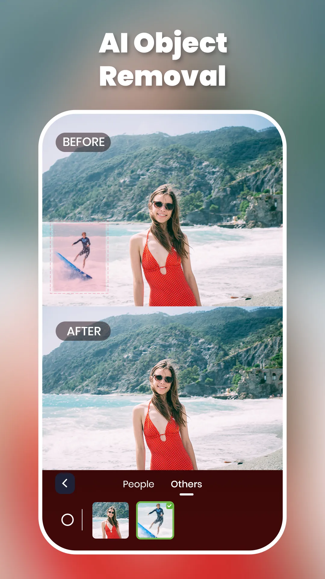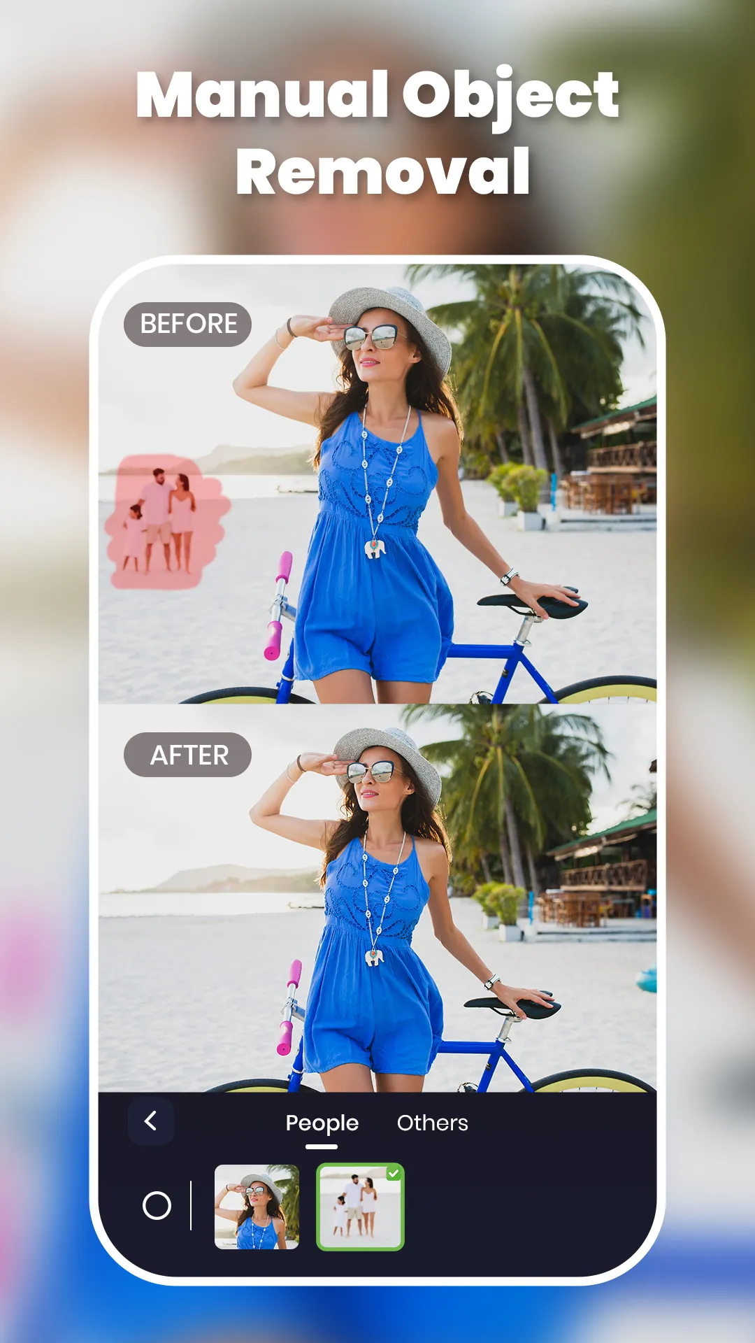 Photo Object Remover is the ultimate photo retouch object removal app for effortless photo retouching. Remove objects and achieve seamless photo object removal with just a few taps. Whether it's a stray person, an unwanted watermark, or an unneeded detail, our app ensures high-quality remove objects results using AI magic eraser, watermark remover, image enhancer, colorize photo and more. Remove Objects with Advanced AI photo retouch object removal and image enhancer tools Our object remover app combines cutting-edge AI magic eraser technology with user-friendly tools to simplify photo retouch object removal. Use the watermark remover tool to remove watermark from photos easily. The AI magic eraser detects and erases unwanted elements automatically. For precision, try our manual photo retouch object removal tools—Brush, Lasso, image enhancer and Triangle—to remove background objects and fine-tune your remove objects edits. Colorize photo easily and convert black and white photos to color photos. Edit photo with perfect photo retouch object remover, image enhancer and photo editing tools Remove objects, remove watermark, and enhance your pictures with our all-in-one photo retouch object removal tools. Whether you want to remove people from photos, erase clutter, or perfect an image for social media, Photo Object Remover delivers professional results. Use the AI magic eraser to simplify the process or take control with manual tools. Let the image enhancer and colorize photo tools bring your pictures to life. Features of Object Remover...