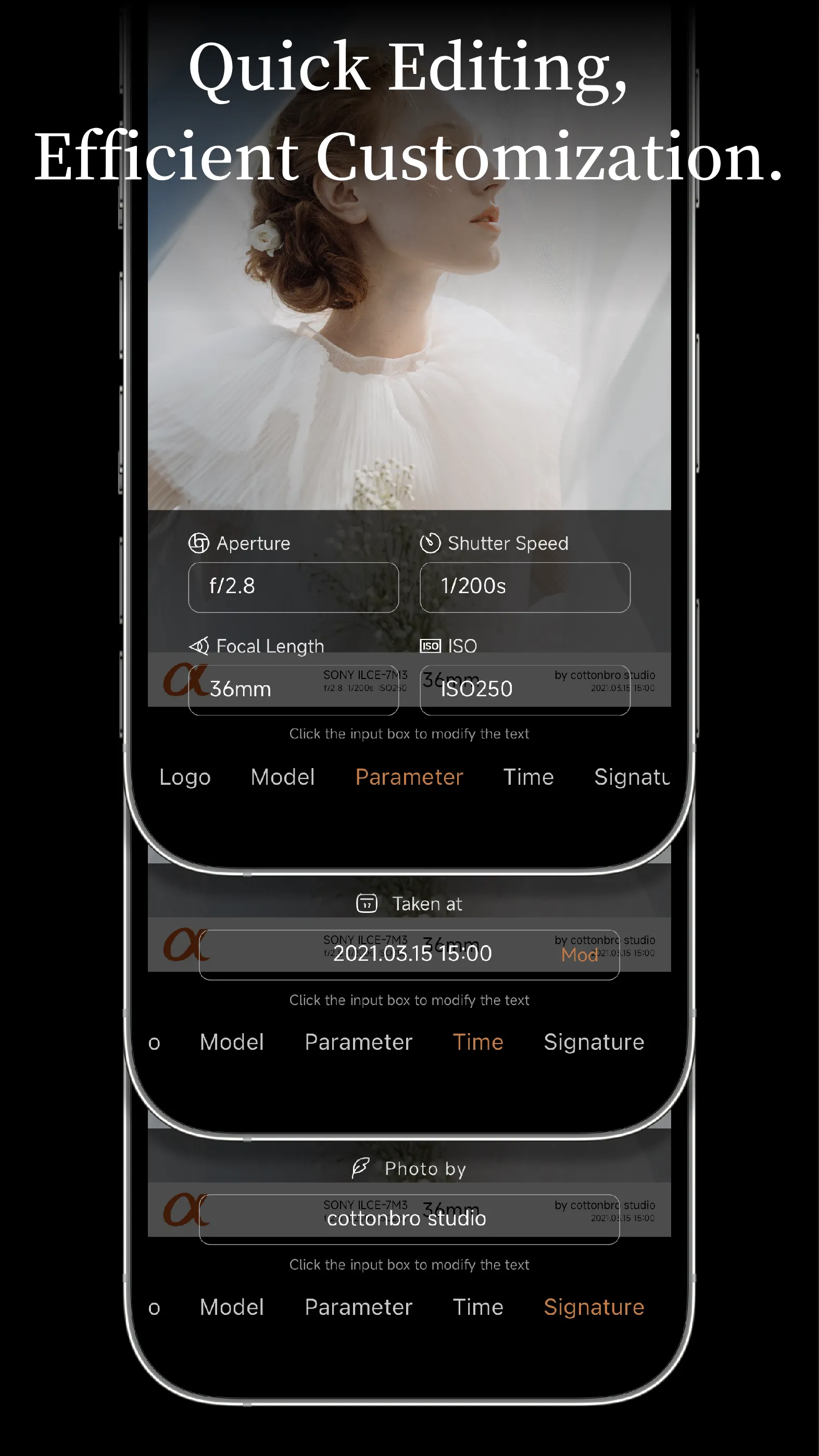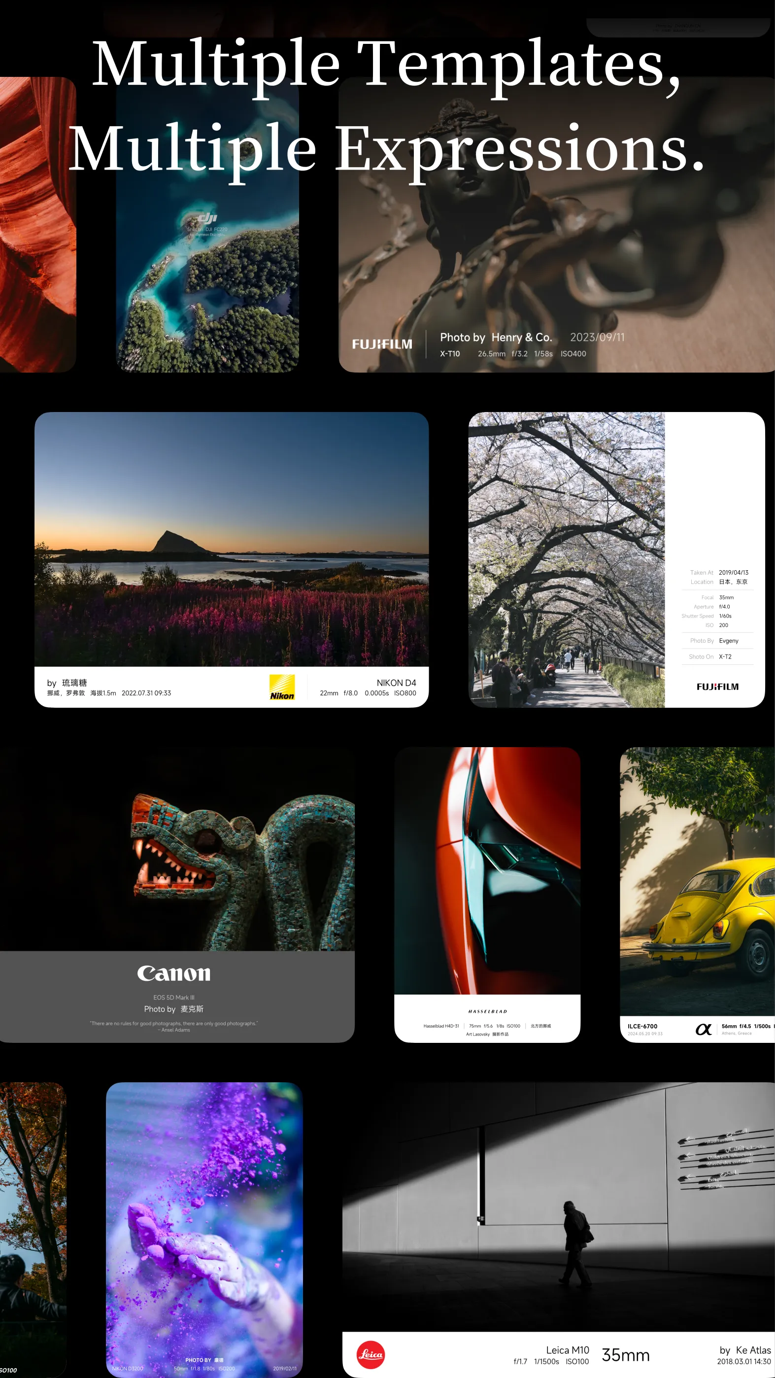 Level up your pics! Pro EXIF data, Leica watermarks & vintage frames in one tap. Batch export like a boss. Add EXIF watermark. Friends will ask "Who shot this?!" IG feed = instant upgrade! Auto add EXIF watermarks, iconic camera logos, and personal signatures to your photos. With elegant watermark designs, minimalist parameter frames, and magazine-style cover templates continually updated, we target your essential need for one-touch EXIF addition, meeting your stringent aesthetic standards. A light and beautiful signature, concise and accurate parameters — both a visual embellishment and a powerful tool to enhance the completeness and recognizability of your photographic works. Our goal is to have OneLine in hand, photo perfection in mind. ...