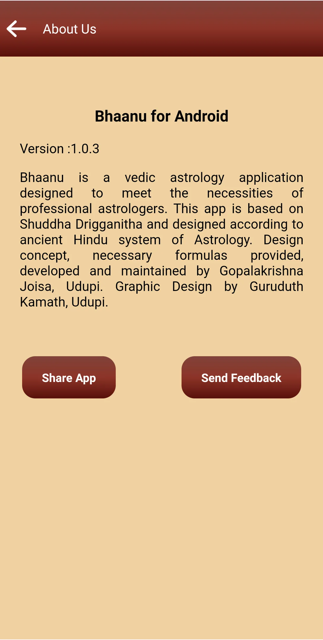 Bhanu is an useful android app for astrologers who practice vedic astrology. It helps to generate horoscope with accurate siderial planetary longitudes , Rasi , Navamsha , Bhava kundali , Dasha Bhukti , Shadvarga , Ashtakavarga along with some calculations required for AshtaMangala Prashna . Shuddha Drigganitha system is used to get the results. It supports both South and North Kundali styles. Also this app supports 4 languages such as English, Kannada , Hindi and Malayalam.