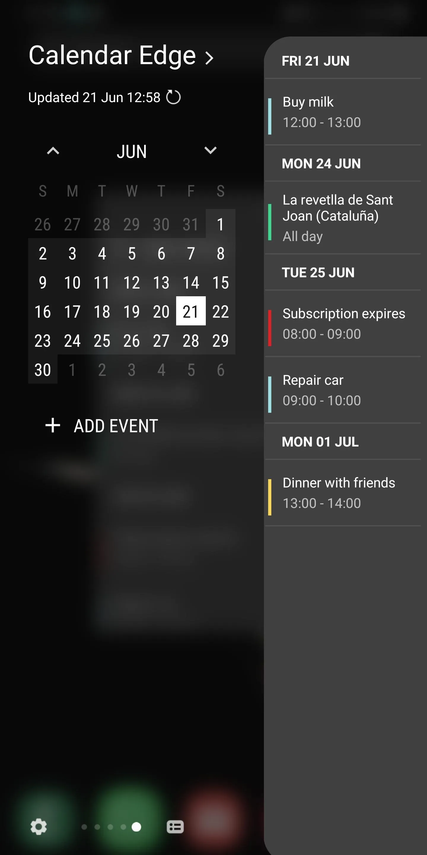 Show all your calendar events in this useful widget or edge panel. This utility will love you. It is a widget on your main application launcher screen. Show upcoming events with their title, start and end time (or if they last all day) as well as their color on your calendar. Compatible with the Google or Samsung calendar, among others. ...