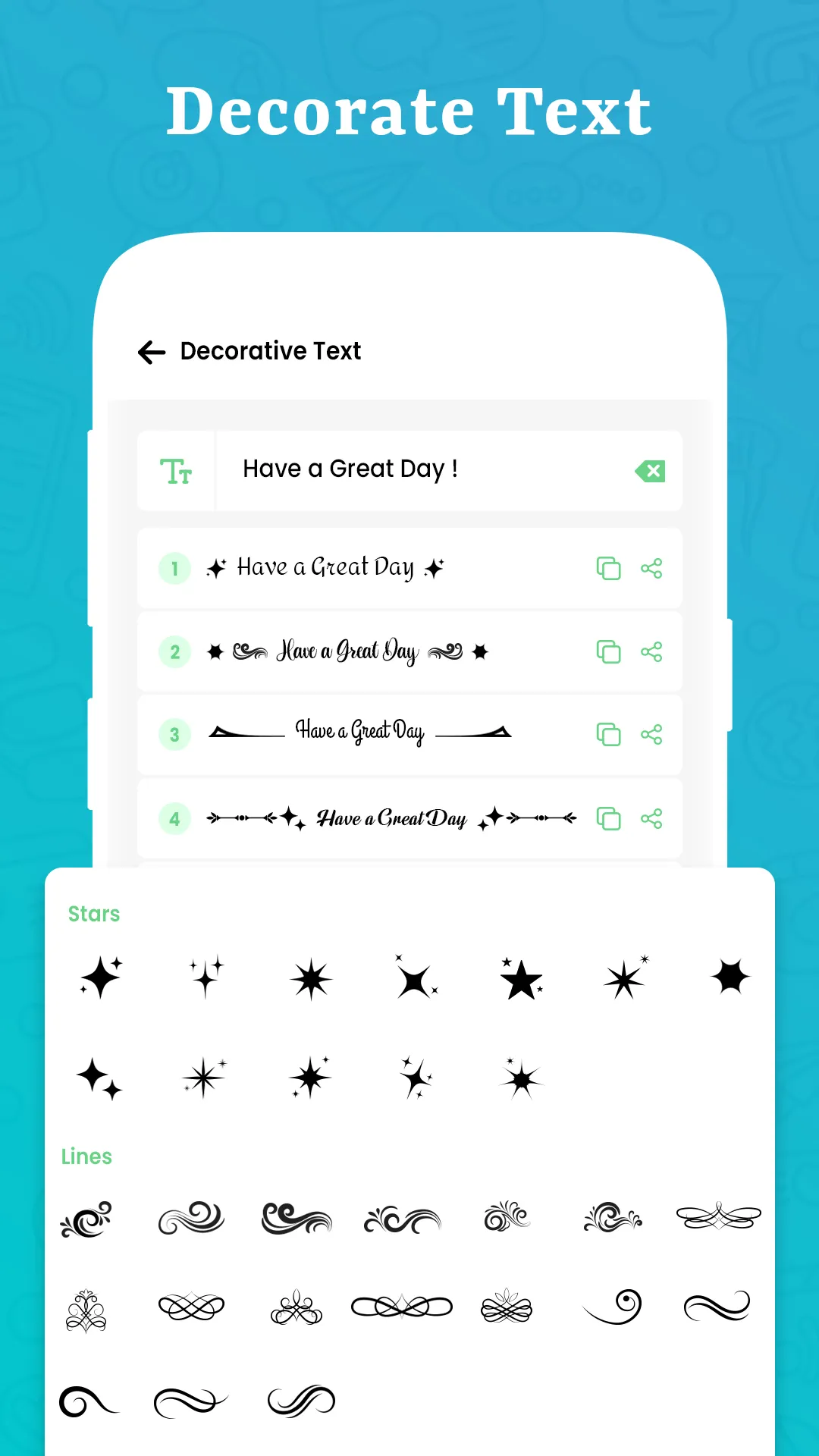 Got tired of normal texts? Want your bios on social media or nickname in games to be attractive and unique? then this is the master peace for you. A stylish text looks distinctive enough to catch eye-balls, With this Chat style for Whatsapp, you will have a ton of cool symbols to make the designer text and impress your friends a super-duper cool nickname, Cool Bio or a funky stylish text. The chat style for whatsapp is very easy to use and user friendly application, Just write your text, status, message or quote and check the various stylish texts. you can pick any of the various styles and send them as whatsapp font directly on this popular messaging app. However, you may use it for messenger and as a shareable link to be opened in any browser. Your fancy text can be seen anywhere! ...