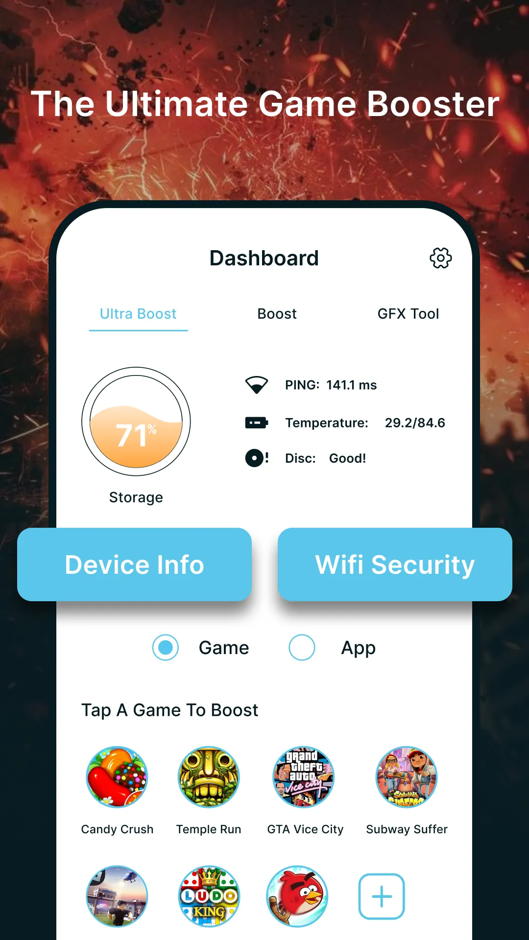 The Game Booster app manages all your favourite game apps in one place. It allows you to launch your favourite games and apps from the app. It comes with various tool that helps you to play the game uninterruptedly, show time spent on gameplay and provide FPS widgets that improve your gaming accuracy. Automatically boost, close background apps. This app is the All-In-One Toolbox (Game Launcher, Game Booster) Key Features: 🚀 Boost Your Gaming Performance: Experience smoother and more responsive gameplay as our app optimizes your device's network settings, reducing latency and ensuring a lag-free gaming experience. Elevate your gaming to the next level and dominate the competition....