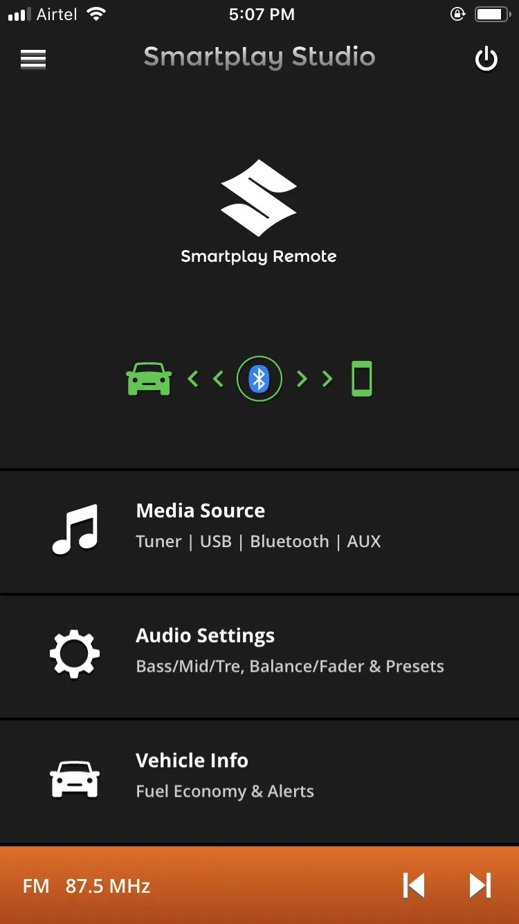 An app that connects to the Maruti Suzuki SmartPlay Studio infotainment system over Bluetooth. Using the app, user can control certain functionalities of the SmartPlay Studio, e.g., changing the tuner station, changing the media track, changing the display mode of the SmartPlay Studio etc. It also provides certain information to the user received from the SmartPlay Studio, e.g., any alerts related to the vehicle, fuel efficiency information etc. This app shall work only with select range of Maru...