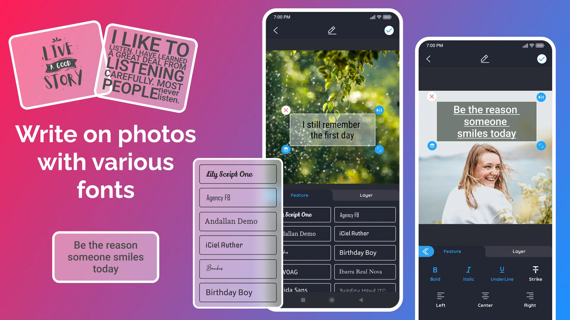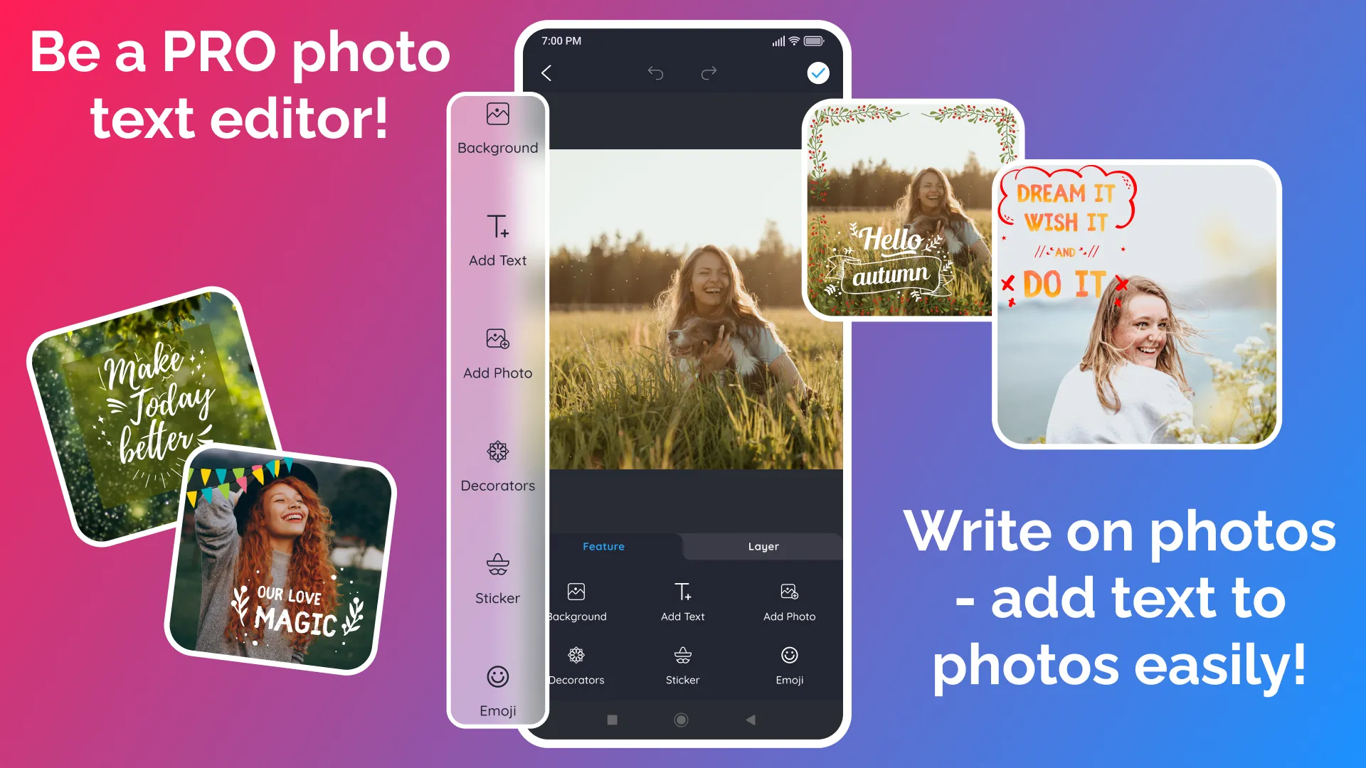 Start using Text Art - Add Text to Photos App a unique photo text editor. The best tool to add text to photos for free. ADD TEXT ON PHOTO & APPLY 100+ PHOTO FILTERS Do you want to put words on pictures and need a free write on pictures app? Want to also use powerful photo editing filters and tools besides putting text on photos? ...