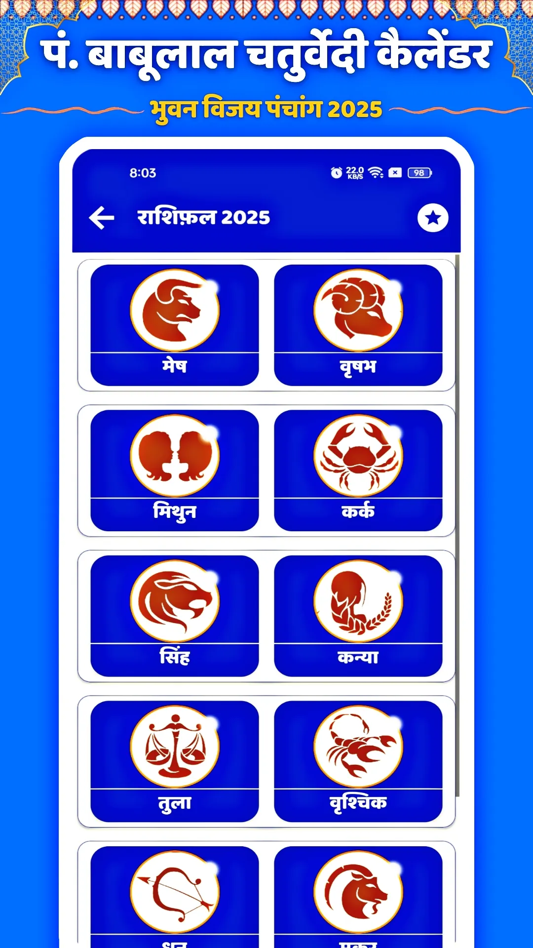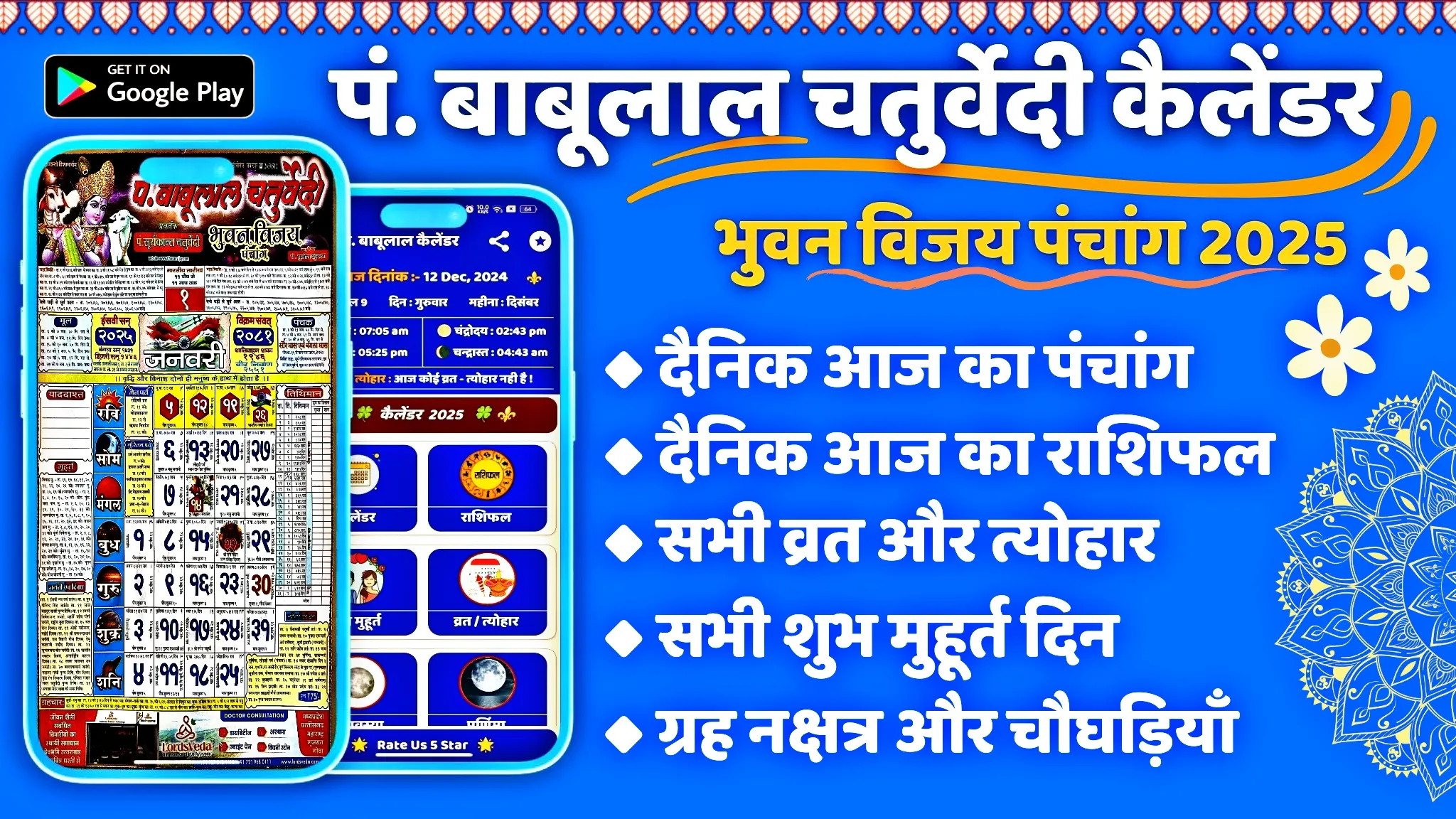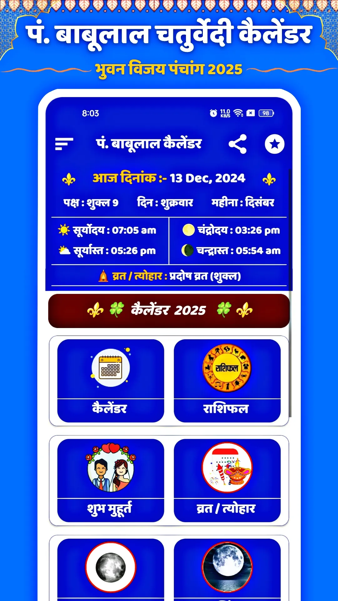 Pandit babulal Chaturvedi Calendar 2025 hindu panchang cum calendar is a traditional panchang which is famous all over India. This panchang contains detailed information about our heritage, culture. its also contains festival, yearly horoscope, marriage dates according to panchang, dishasul, and calendar. you can imagine the popularity of this calendar by this sentence In india there is any house which has not a Babulal Chaturvedi Panchang. The Babulal Chaturvedi Calendar 2025 app is a worldwide free almanack calendar app. This calendar provides you all month horoscope, marriage muhuraths, rashifal, shub shadi tharik and festival details with Hindu, Muslim, Sikh, Isai and Govt holidays list. ...