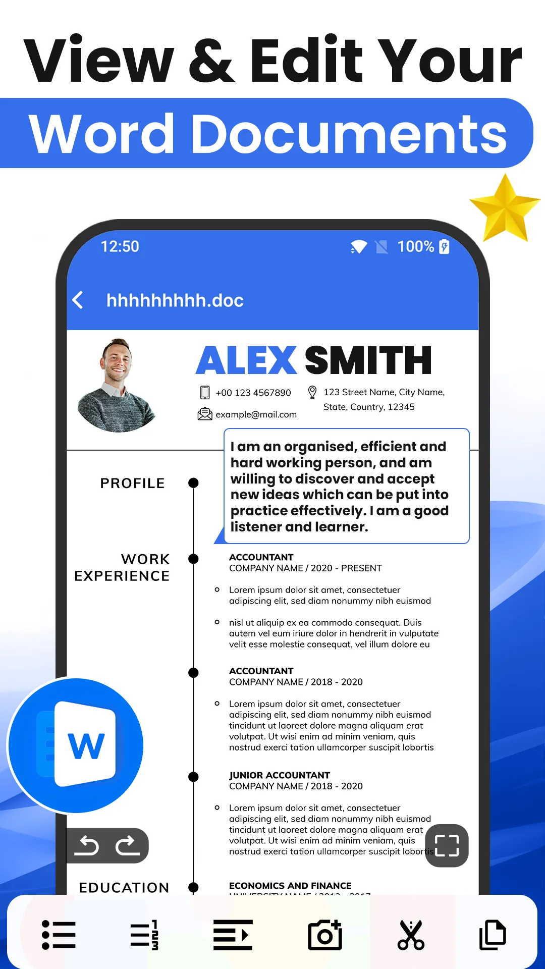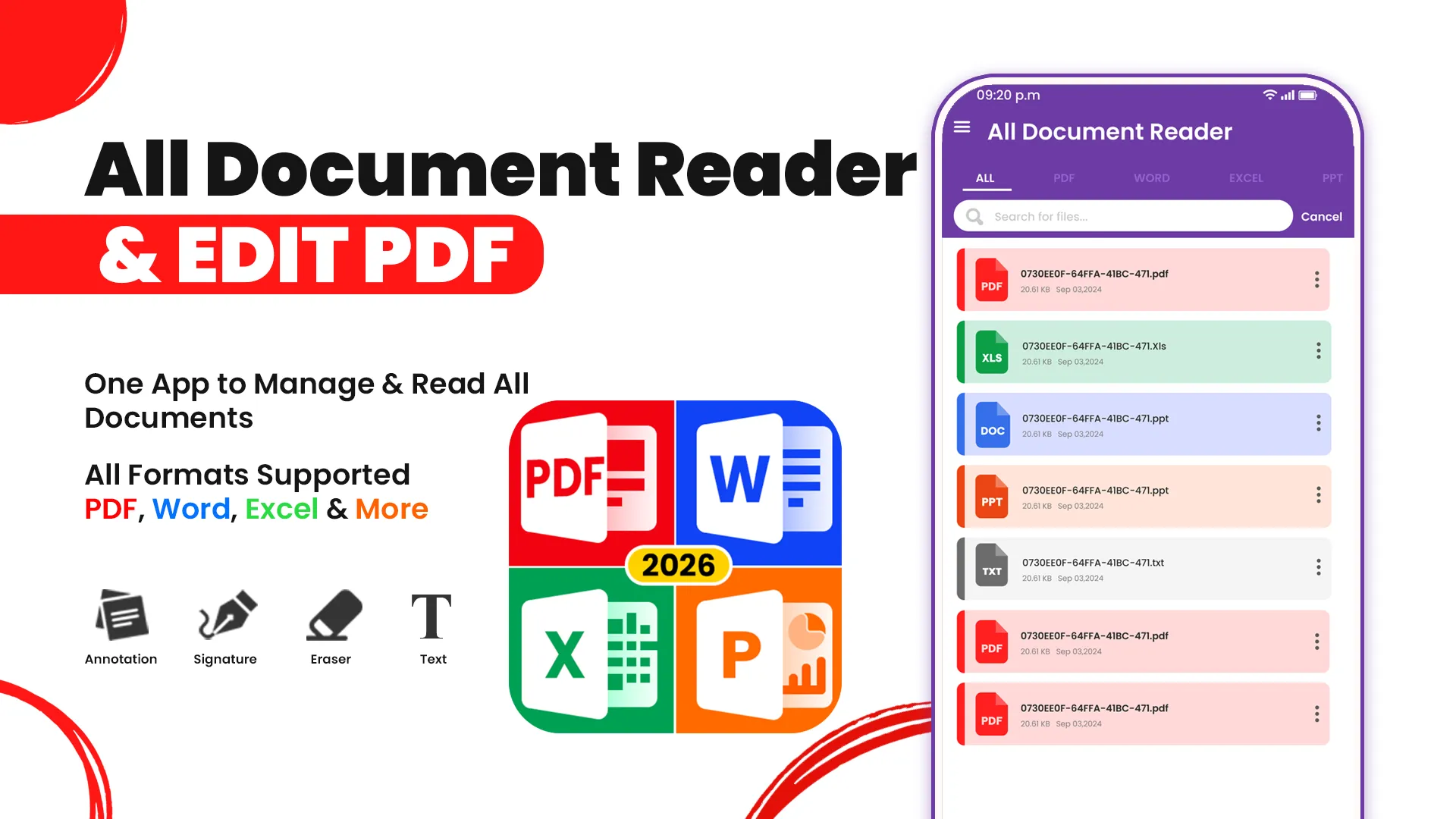 Looking for a smooth document reading experience? All Document Reader - Edit PDF is a full-featured office reader with document editor that combines fast document reading. This All Document reader and viewer lets you read PDF/DOC/PPT/XLS effortlessly. ✨ Document Reader & Editor Key Features: Document Reader PDF Viewer: Instantly open and view PDF, DOCX, PPT, XLS, TXT, and more within this document viewer app. All Document Editor: Highlight, insert text and images, or draw & sign, directly inside your documents using our all document reader PDF editor. Document Reader for Android Offline: Access and read PDF files editor even without internet using our PDF reader app offline....