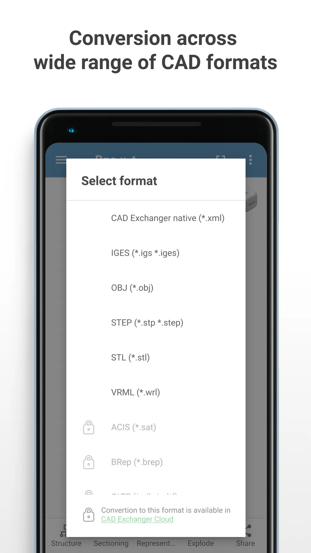 CAD Exchanger allows to view, explore, and convert 3D CAD models across 30+ key CAD formats, incl. native (SOLIDWORKS, CATIA, Siemens NX, DWG...), neutral (JT, STEP, IGES, IFC...) and kernel (Parasolid, Rhino, ACIS...) formats. Whether you are on a shop floor, at a business meeting, or just outside your office you can still work with your 3D models and share files with your partners. Free mobile version of CAD Exchanger complements more feature-rich commercial desktop and Cloud versions. All of them run on CAD Exchanger SDK, our own CAD formats conversion technologies which you can use to build your own 3D mobile, web and desktop apps: https://cadexchanger.com/developers. ...