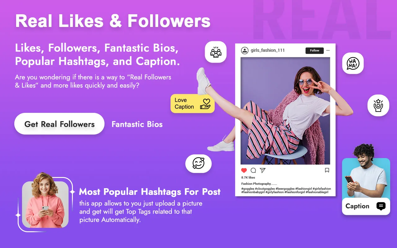 Boost your 🤩 Instagram presence organically with high-quality hashtags, trending captions, and powerful photo editing tools designed to attract real followers and increase engagement. Our app help you grow your followers base. There are more than 10,000 quotes and more than 30 categories. Grow fast your Followers that follow you in your profile and get more hearts even more easy. With powerful followers photo tools, you can grow your followers quickly. By creating your own special photo, grow fast your followers that follow you in your profile and get more likes....