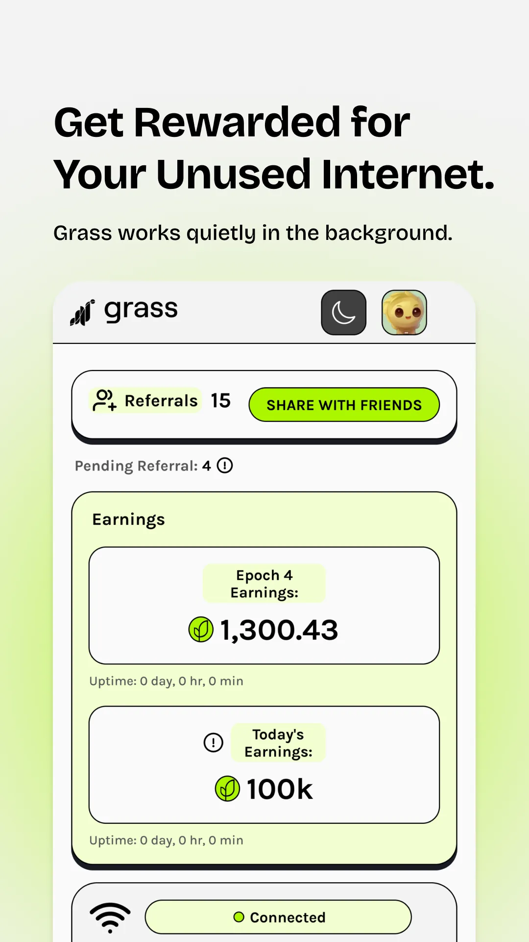 You already pay for internet every month, but most of it goes unused. Grass turns that unused part into rewards automatically. Just download the app, let it run in the background, and start earning. In just three taps, you can install the app and share the unused part of your internet connection with verified institutions. Grass cannot see your private data or online activity, only the unused part of your connection is shared. Your participation is tracked through Grass Points, which help determine how many Grass Token rewards you receive over time....