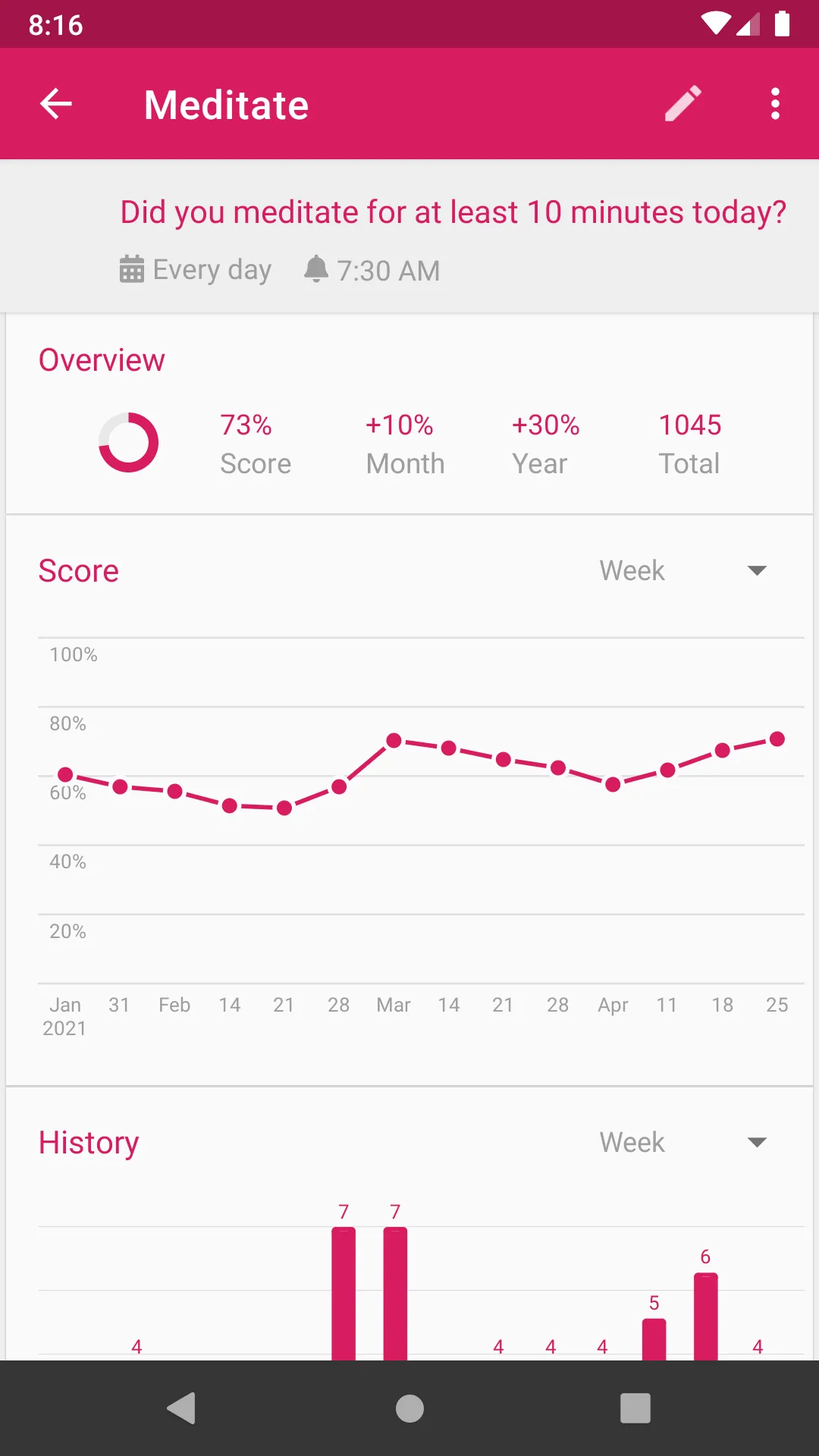 Loop helps you create and maintain good habits, allowing you to achieve your long-term goals. Detailed charts and statistics show you how your habits improved over time. The app is completely ad-free, open source and it respects your privacy. Simple, beautiful and modern interface Loop has a minimalistic interface that is very easy to use and follows the material design guidelines. ...