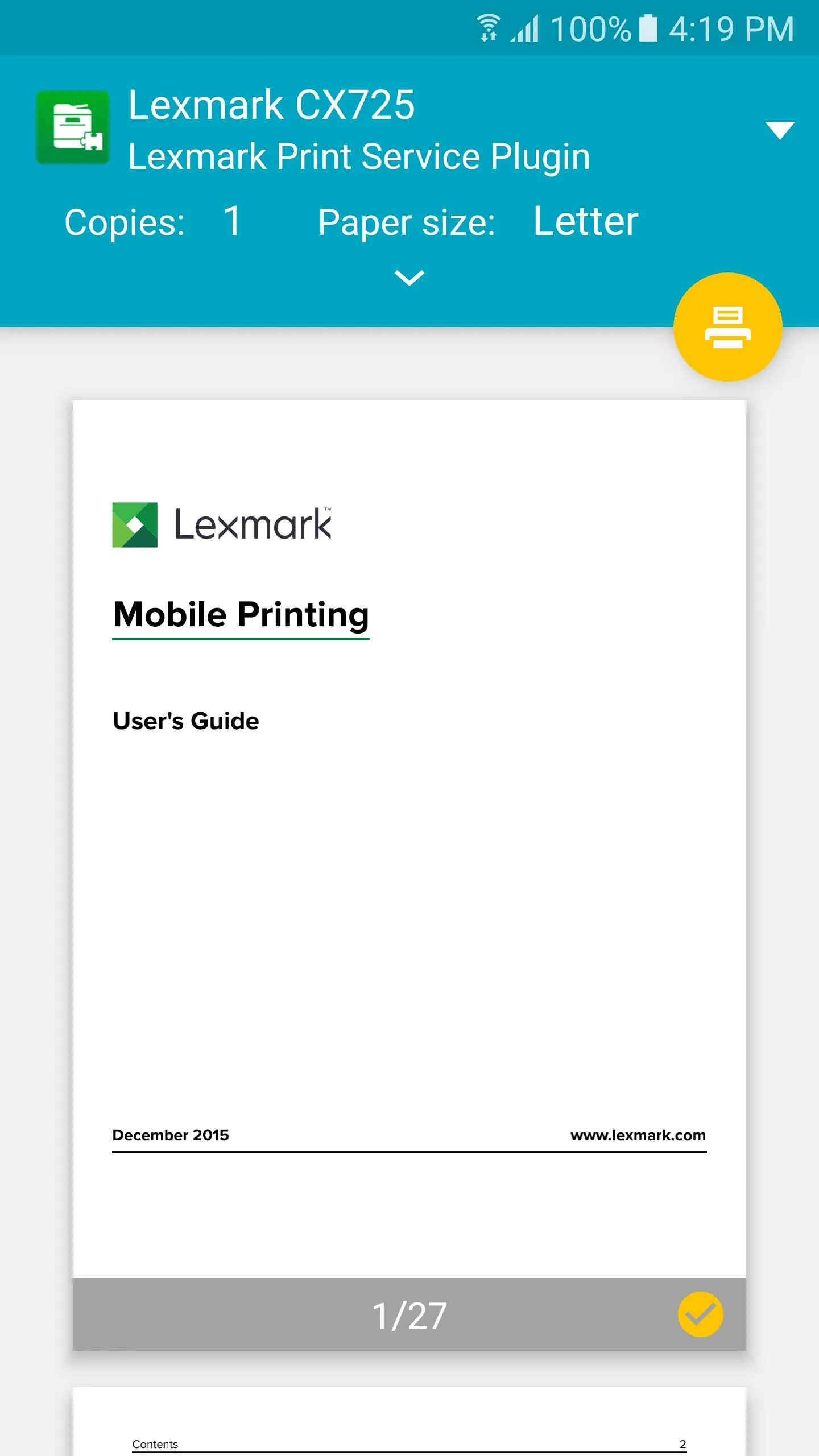 The Lexmark print service plugin enables native printing from your Android device to supported Lexmark products without requiring a 3rd party app. Documents and images can be easily printed directly to Lexmark printers on the same network as the Android Device. Familiar printing controls such as paper size, color, orientation, and number of copies are available. Because discovering a printer on an enterprise network can be challenging, features such as QR code scanning are provided to simplify manually adding a printer. For enterprise scalability and security, the Lexmark print service plugin also supports printing to a Lexmark Print Management Server. The application is available for free download from Google Play. Minimum operating system requirements • 5.1...