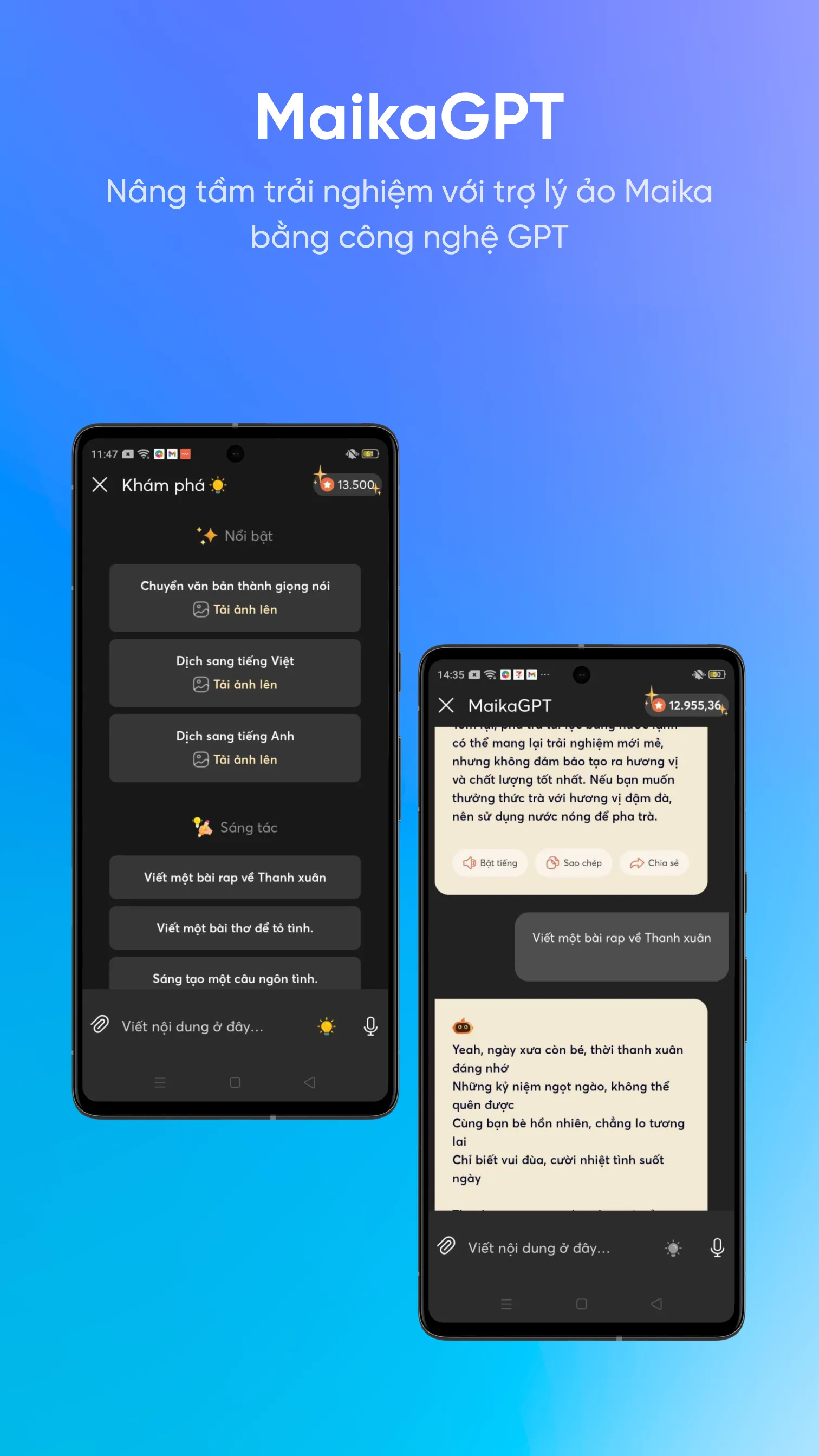 MAIKA, developed by OLLI Technology, is an AI assistant designed to enhance work and daily life. Its purpose is to transform technological advancements into practical conveniences, providing users with numerous benefits. MAIKA offers a wide range of features that cater to various needs. Users can interact with MAIKA through voice commands and use its extensive integrated content library. SIMPLIFY YOUR LIFE WITH VOICE TECHNOLOGY • Control smart home devices like air conditioners, lights, fans, TVs, etc., using 100% Vietnamese voice commands....