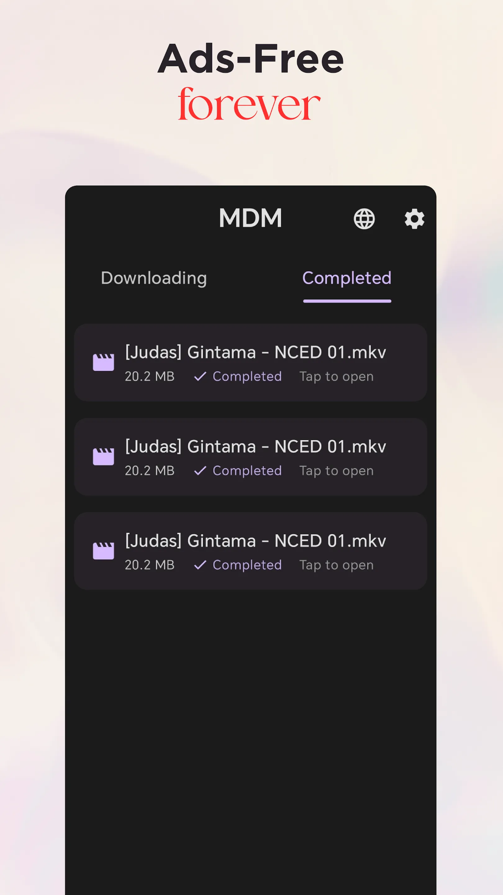 A straightforward Android Download Manager using Material You design language. It is ad-free, fast and simple. Features: - Super fast downloads - Ad-Free Forever - Supports every file formats - Resume/Pause downloads at any time - Grab direct download links using built-in browser - Built in Ad-Blocker in the browser - Material You & Amoled Theme Download the best Internet Download Manager (IDM), Material Download Manager (MDM) for your device today.