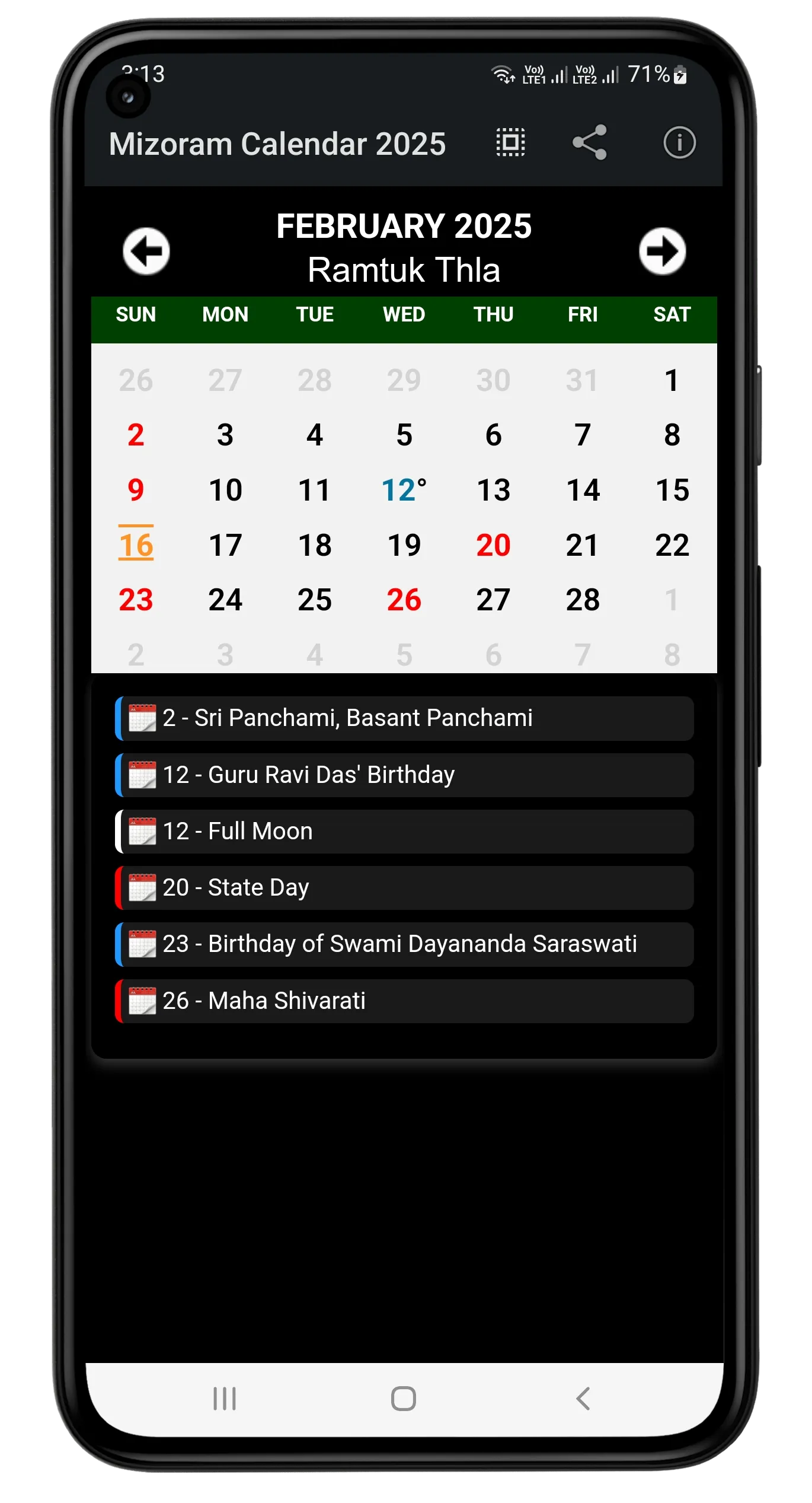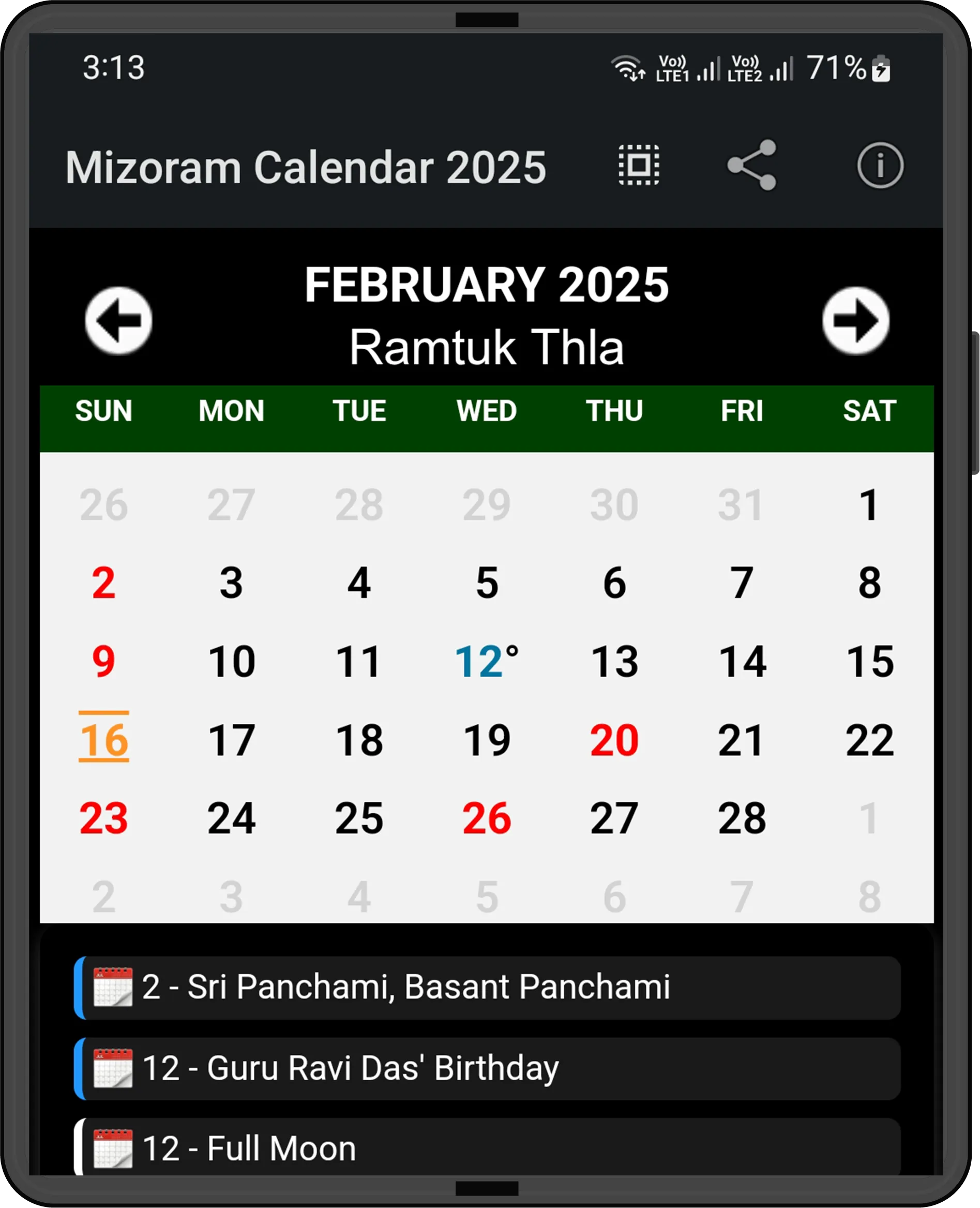 A simple calendar app for Mizoram State. ✦ Red Color = State, National Holidays. ✦ Yellow Color = Current Day. ✦ Blue Color = Special Event, Restricted Holidays. Disclaimer: This app is not linked with Mizoram Government in any way. This application is not sponsored by the State Government. The app provide information (holidays) aggregated from various trusted sources and from the State Government website (https://dipr.mizoram.gov.in/post/mizoram-calendar-2025) which is already available in the...