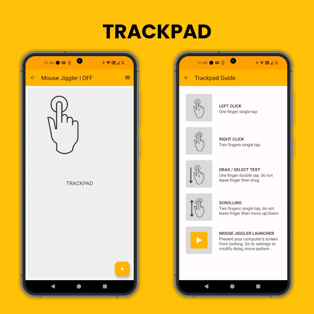 This App transforms your phone or tablet into a Touchpad / Trackpad / Mouse Jiggler for your computer (compatible with Windows, Mac, iOS, and Android). It connects via Bluetooth and there’s no need to install any software on your computer. The App simulates Trackpad / Touchpad functions such as left click, right click, drag, and scrolling. The "Mouse Jiggler" feature prevents your computer’s screen from locking by periodically moving your mouse cursor by a few millimeters. This function can run in the background, allowing you to use other apps on your phone simultaneously. ...