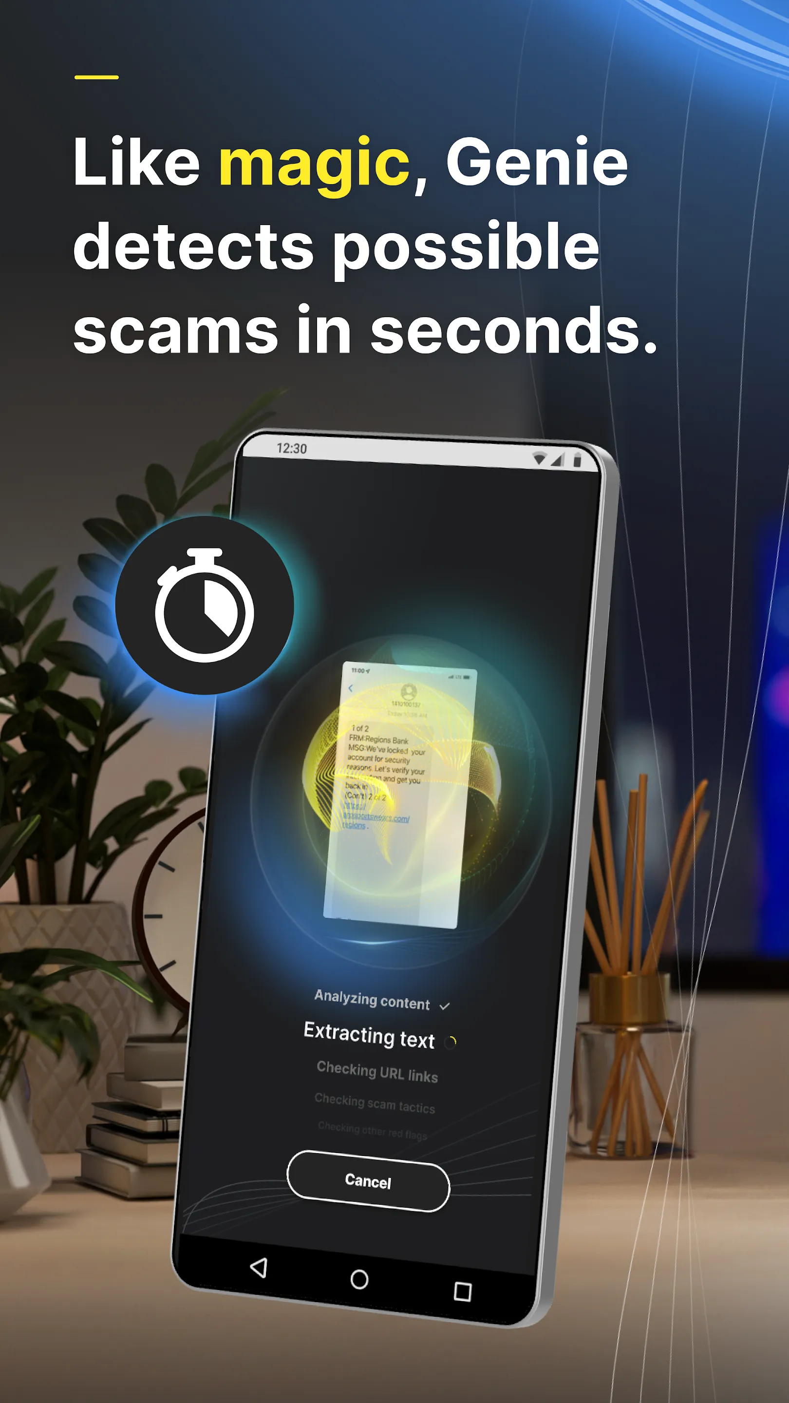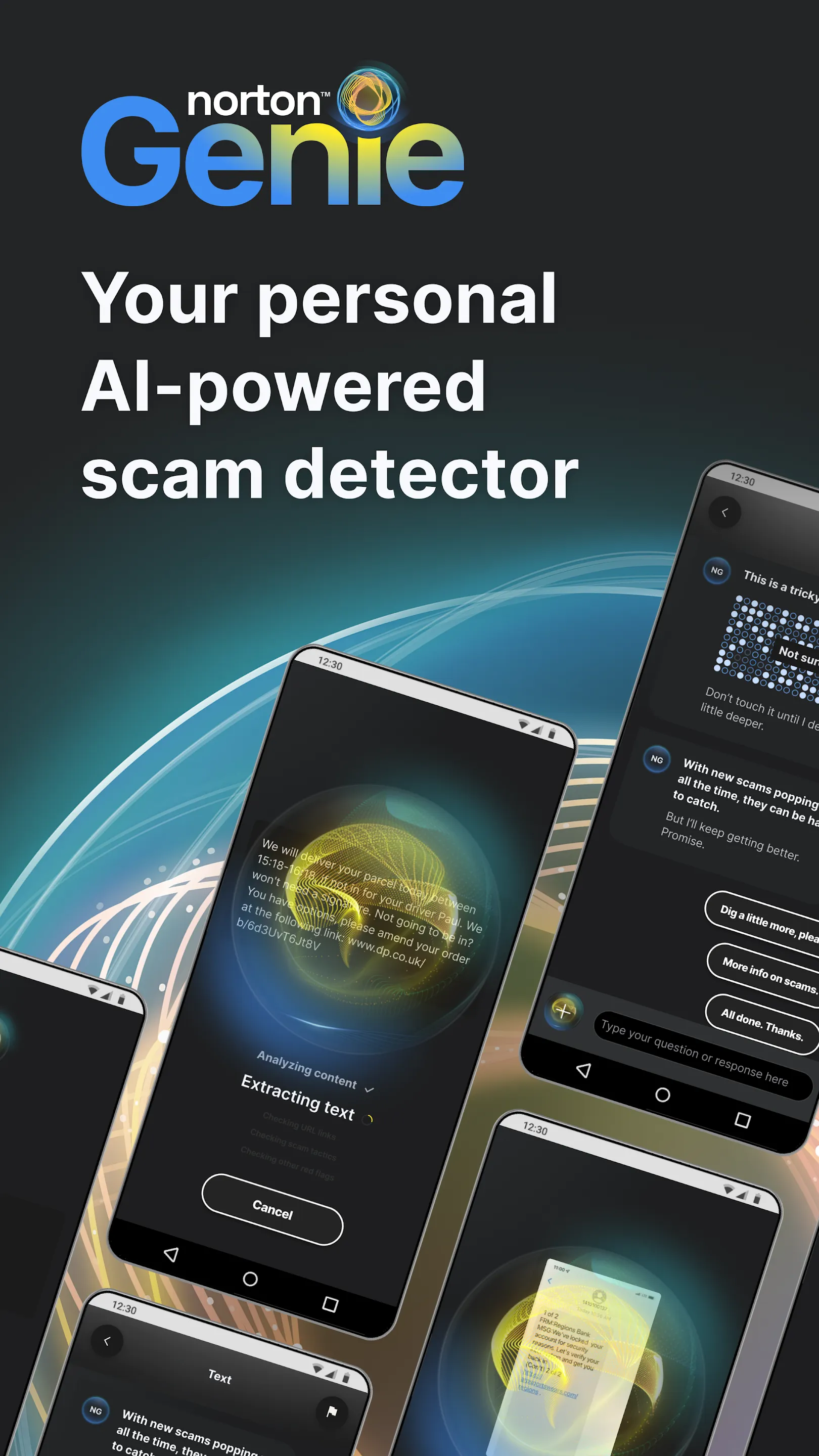 Introducing Norton Genie. Your personal AI-powered scam detector. Genie is an industry leading AI-powered scam detection tool that will scan and review text messages, emails, websites, and social posts trying to trick you. You’ll get instant advice on whether the message or site is potentially a scam, so you'll know if it’s safe. [1] - Have you received a text message from a suspicious or unknown sender? - Was an email delivered to your inbox by someone pretending to be your bank or insurance company? - Is that offer advertised on social media too good to be true? - Does a website feel like it could be a scam? Did you really find the best price or does the site just want your credit card info?...