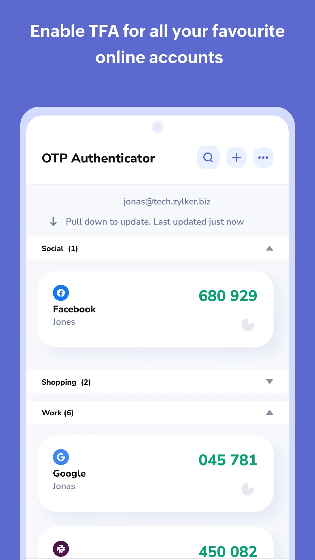 OneAuth is an industry standard authenticator app developed by Zoho. You can now enable TFA and secure all your online accounts like Twitter, Facebook, LinkedIn, and more. Over 1 million users trust OneAuth to enable 2FA and secure their online accounts. Take charge of your online security with two factor authentication ...