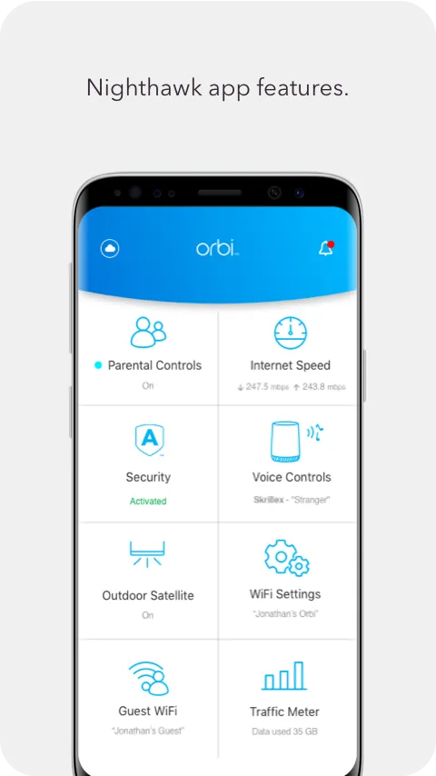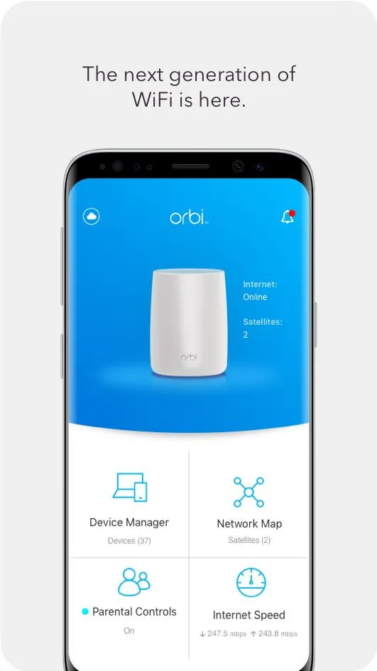 The NETGEAR Orbi app gives you convenient access to your router’s features: - Anywhere Access – Monitor and control your home WiFi from anywhere. - Smart Parental Controls - Filter content and limit time online automatically with Circle® on NETGEAR. - Armor Security – Advanced cybersecurity on your network to protect all devices from online threats. - Speed Test – See if you’re getting the internet broadband speeds you’re paying for. - Guest WiFi – Set up a secure and separate WiFi network for guests. ...