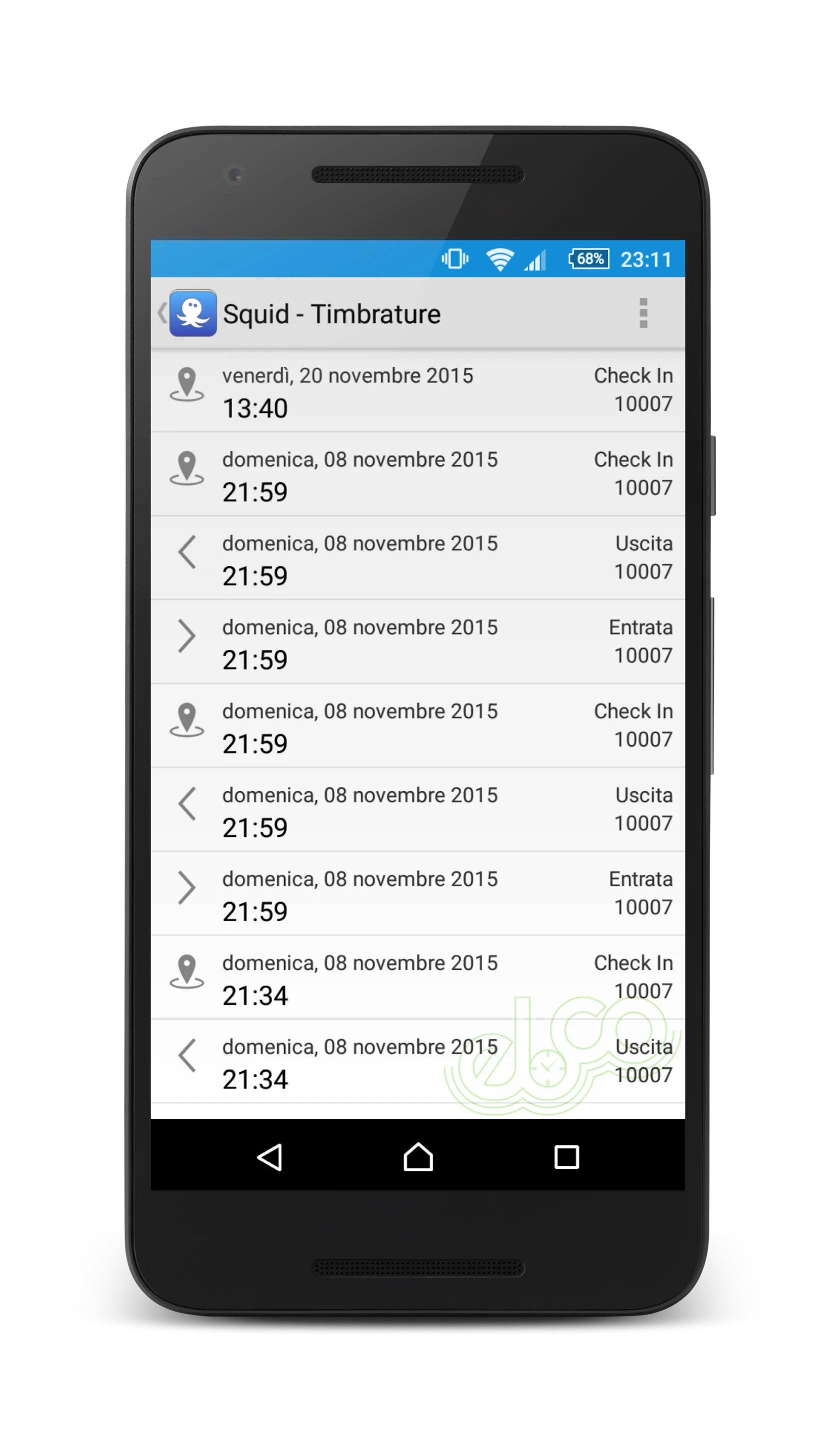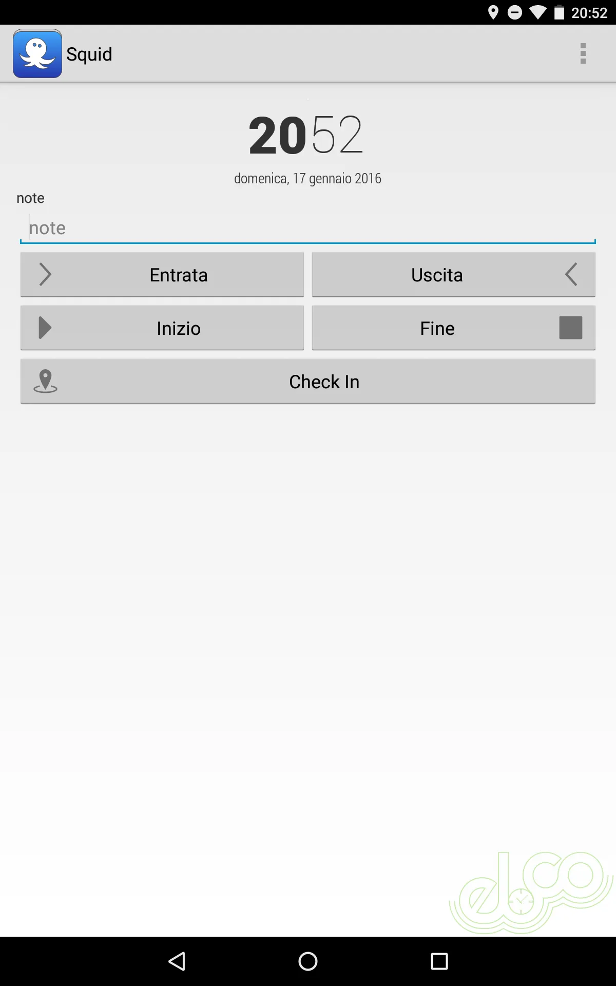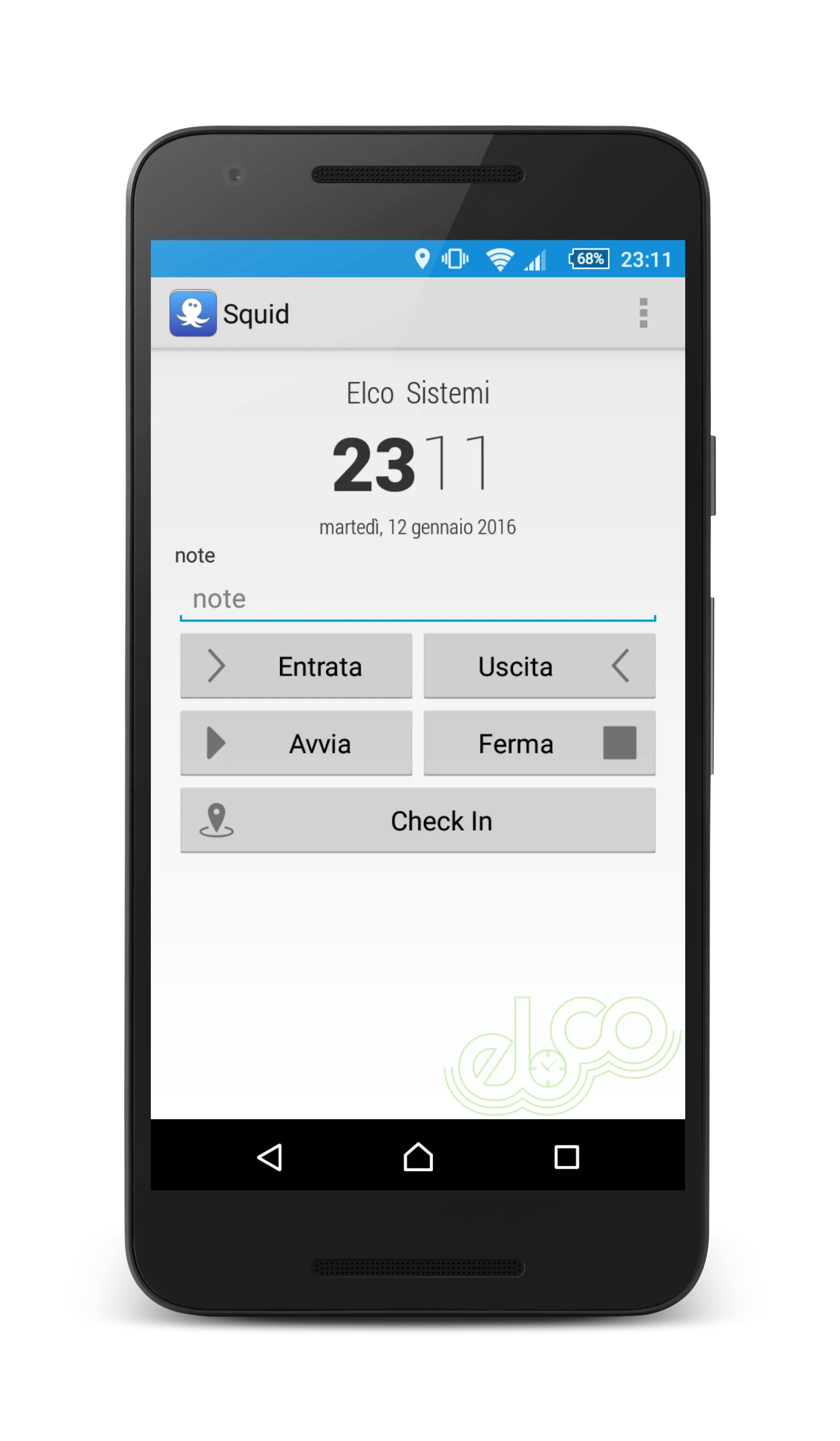 Squid. The time and attendance terminal, fully configurable, right on your Android smartphone. For any type of stamping (attendance, production, check-in) to be performed outside the workplace (ie without the disponibiltà of a conventional detection terminal), Squid turns your Android device into a complete terminal, operating at any locations. Allows the precise location of the stamping, recording additional information, the NFC tag reading and continuous tracking of the device....