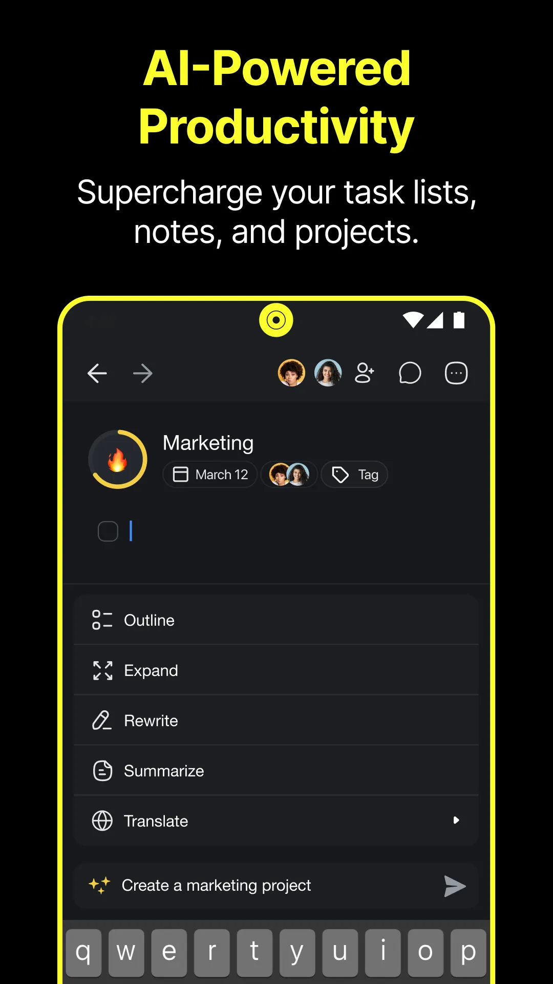 Turn ideas into action with Taskade AI. Generate workflows, automate tasks, and mind map ideas. Chat with AI and get work done in a unified workspace, your second brain. Introducing Taskade AI - your all-in-one AI chat and workflow assistant that supercharges your productivity! With just a few taps, get instant answers to complex questions, generate notes and outlines, organize your tasks and projects, and summarize long-form content. Best of all, it's completely free! To start a new project, head to the Taskade AI Project Studio to craft complete project workflows from scratch effortlessly. Navigate to your workspace or folder, tap the New project button and select AI Project Studio, define the project you want to generate, and let the magic happen. ...