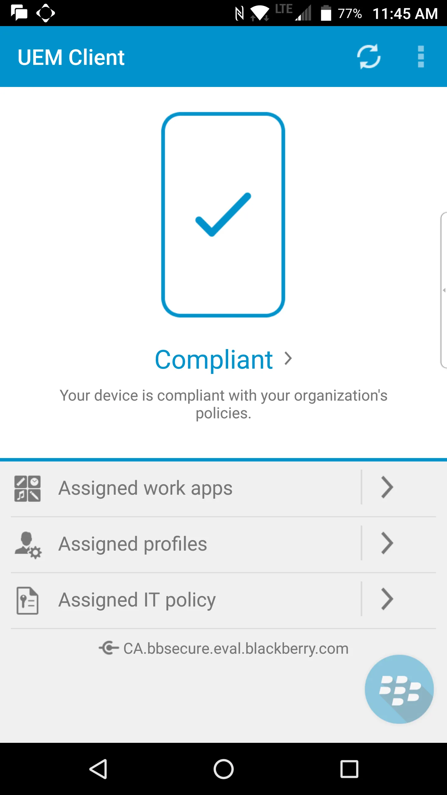 The BlackBerry® UEM Client integrates Android™ devices with your organization’s enterprise mobility management (EMM) software: BlackBerry UEM, BES®12, or BES®10. Once activated, the BlackBerry UEM Client enables: • Secure access to work email, calendars and contacts • Automated configuration of work-related policies, Wi-Fi® and VPN settings • Easy installation of your organization’s approved mobile apps • Dual business and personal use of mobile devices for Bring Your Own Device (BYOD) policies...