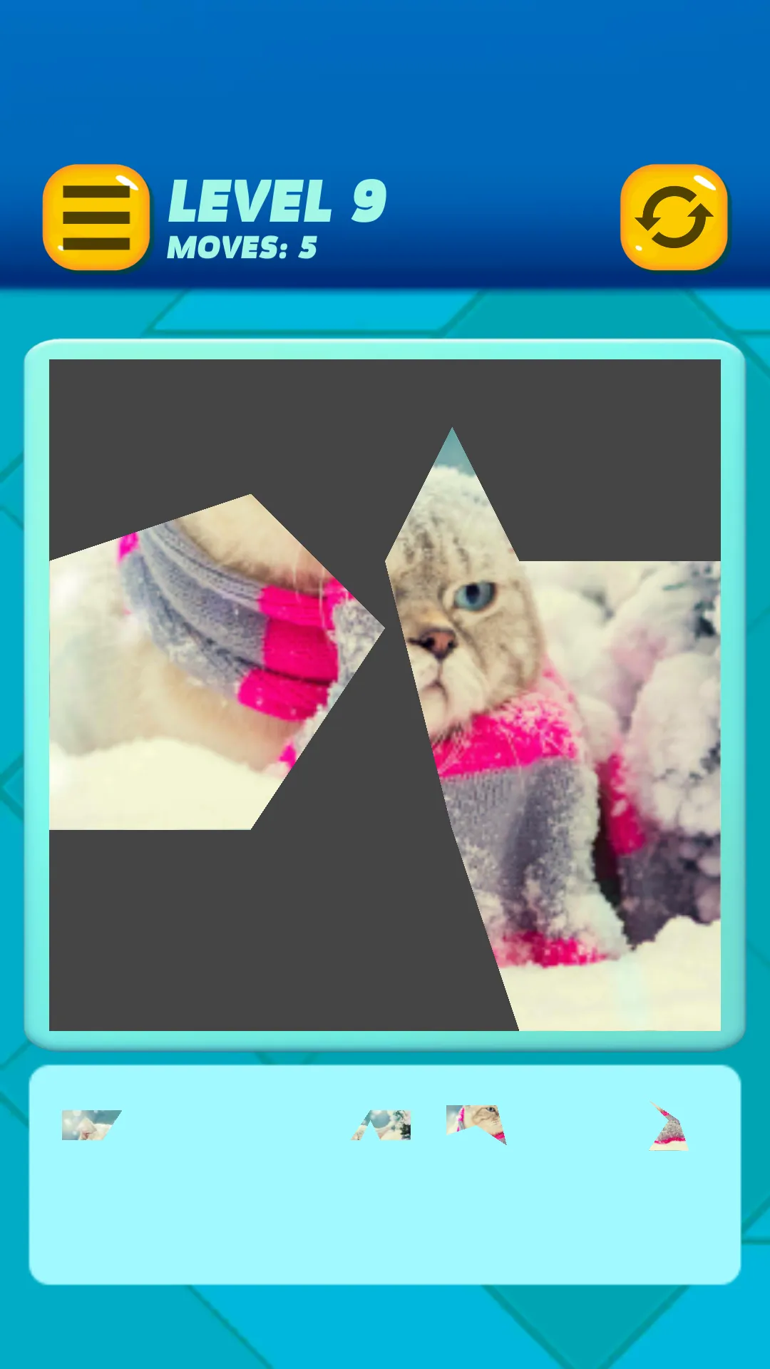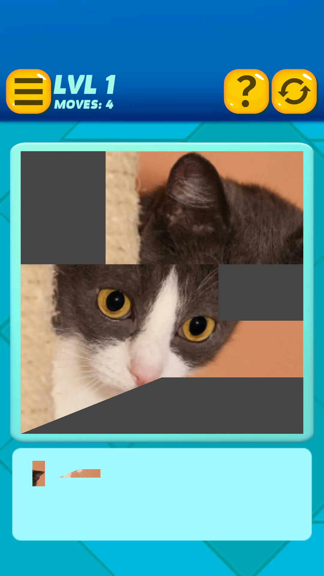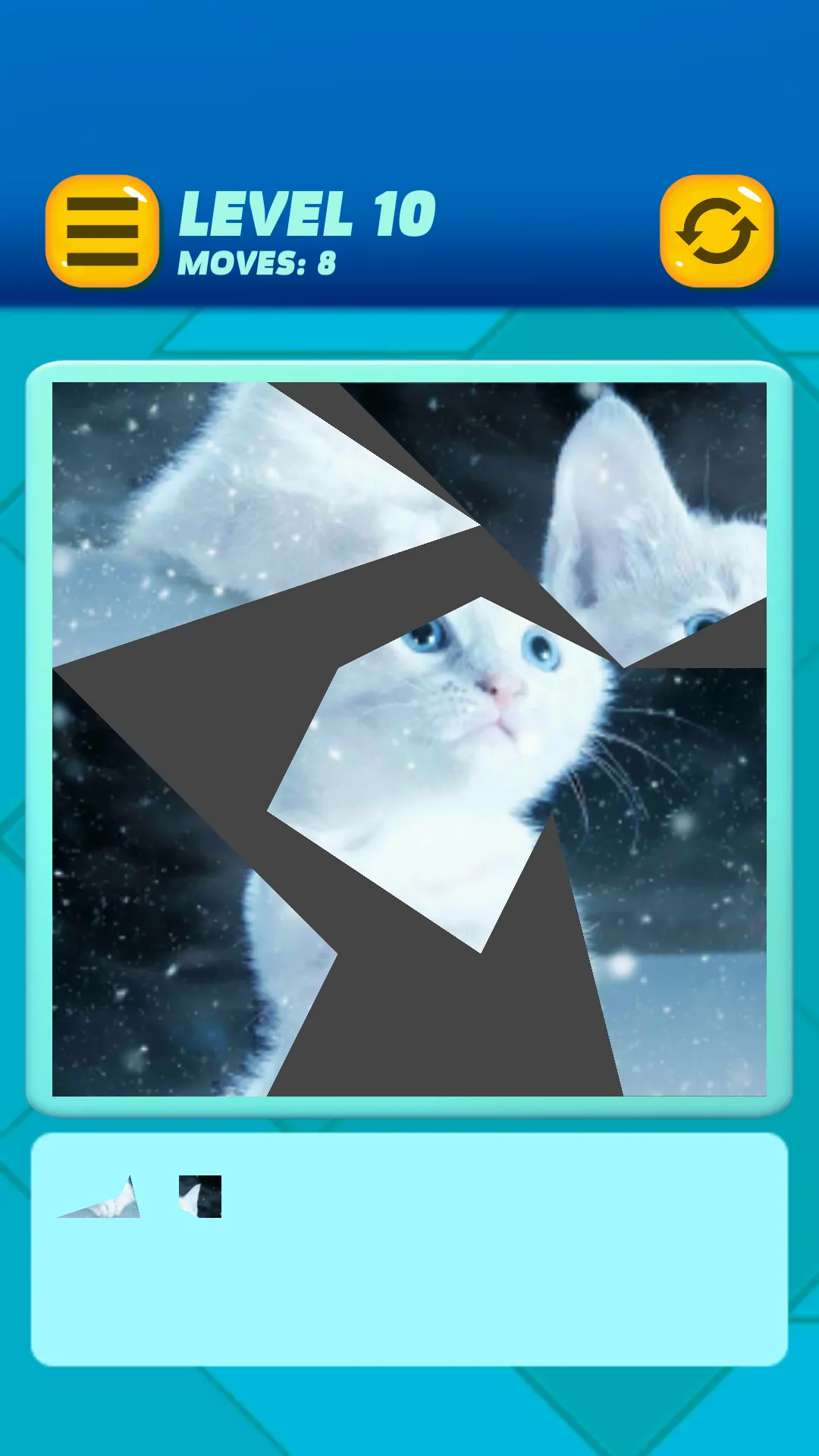 A cozy undemanding game; designed for fans of cats and felines who are looking for relaxing activities related to their favorite animal. The game consists of a blank board, where a cat picture will be formed. Below the boards is a tray, containing puzzle pieces. They resemble tangram pieces, made from cute cat and kitten pictures. Arrange the pieces from the tray into the board, to form a completed picture. Simply tap and drag the pieces to move and rearrange them, or drop them back to the tray. It is like a combination of tangram and jigsaw puzzle. Finding the correct spot on the board can be quite challenging, but this isn't a difficult game. There's a green rectangle to guide the placement. You can always move the pieces if you made a mistake. Features: - 100 puzzles to solve. The difficulty level increases as you progress through each levels. All levels free to play, no purchase required....