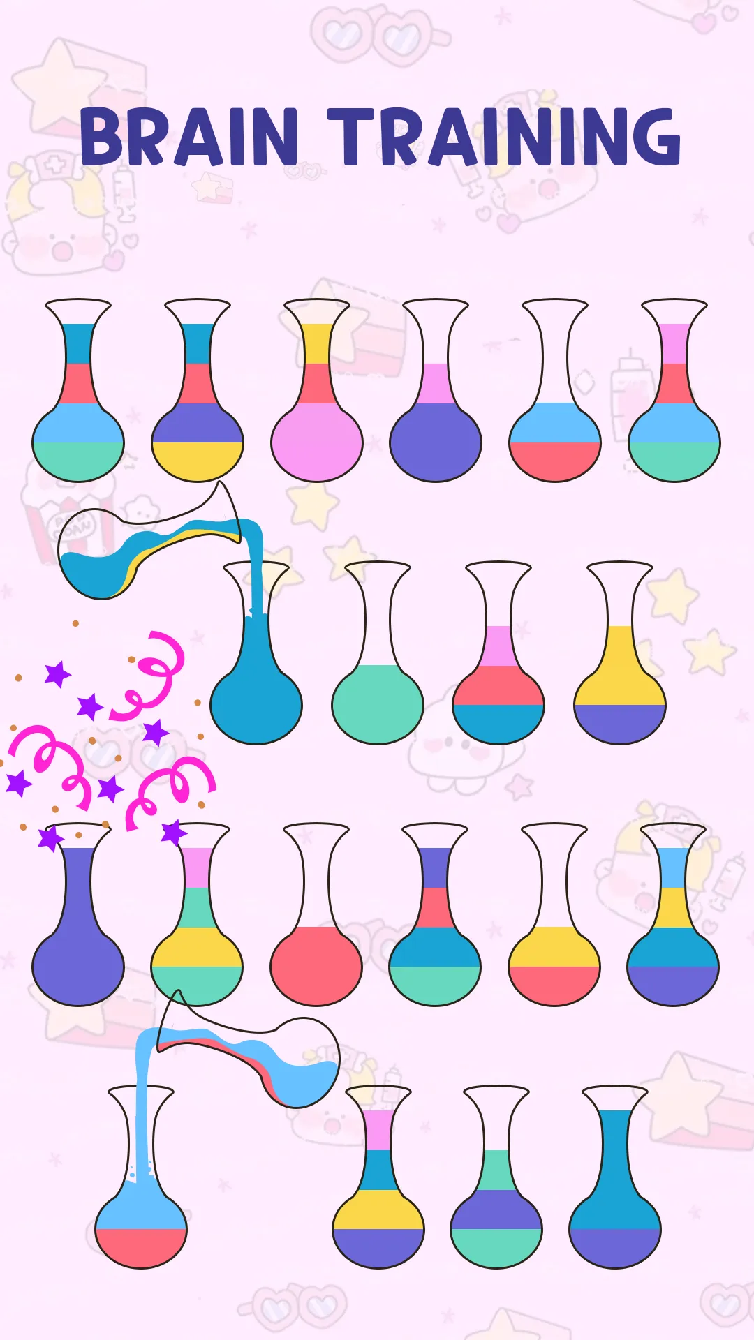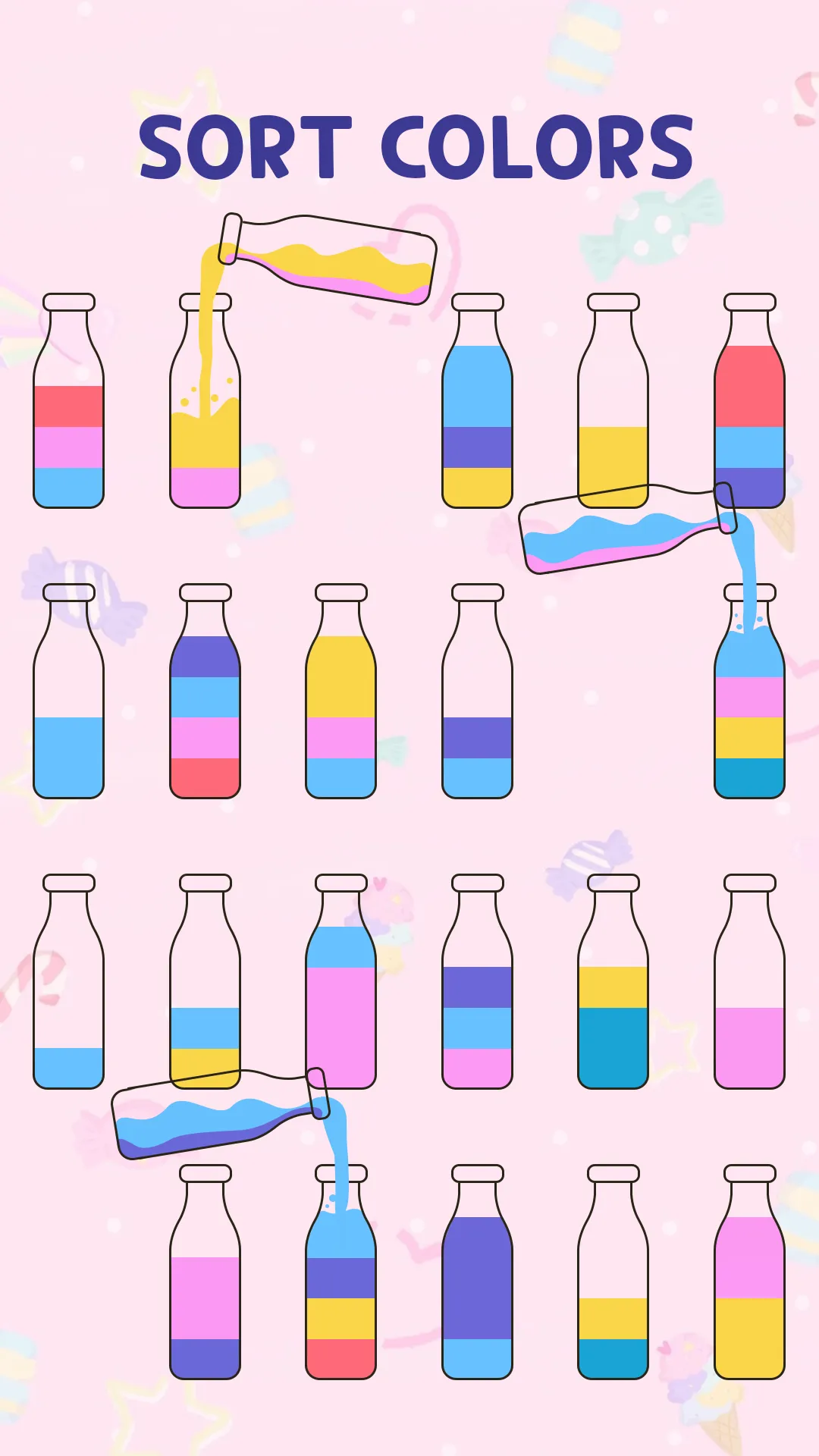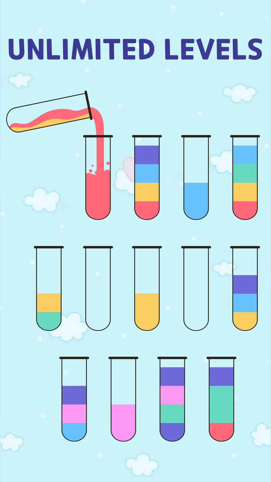 Try to sort the colored water in the bottle until all colors in the same bottle. Pour colored water from one tube to another tube to complete the level. This colorful game seems easy but relaxing game - pouring water - to train your brain. The higher level you reach, the harder it gets since there are more tubes to arrange colors. HOW TO PLAY: - Control with one finger....