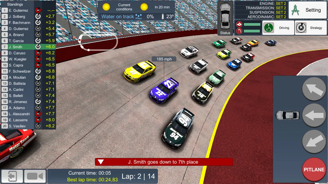 American Speedway is a racing strategy game. Manage your team, upgrade and configure your car to adapt to each race. Compete in a championship of 16 stages and oval circuits of the nascar style, in cities of the United States. California, Tennessee, Darlington, Florida, Dover, Madison, Carolina, Indiana, Iowa, Kansas, Kentucky, Virginia, Michigan, Ohio, Texas, Arizona. TOTAL CAR CONFIGURATION Full configuration of car settings. Engine power adjustments, transmission adjustments, aerodynamics, and suspension adjustments....
