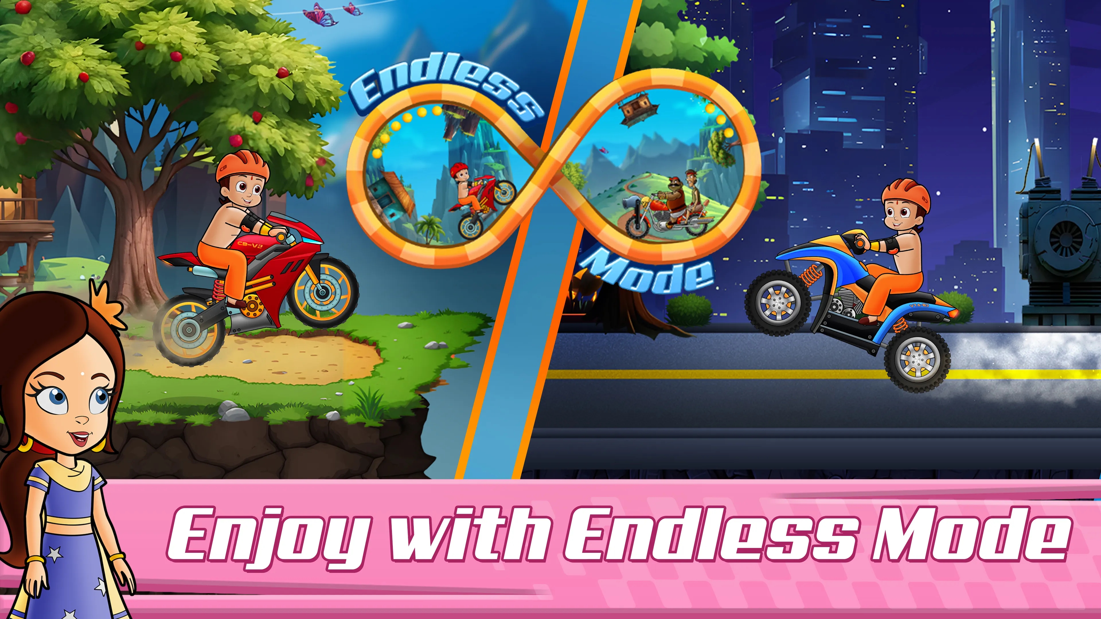 Are you ready for an adventure like no other? Introducing "Chhota Bheem Road Race", the ultimate motorcycle racing game that will keep you on the edge of your seat! Designed for bike and trekking enthusiasts, this thrilling game lets you take control of Bheem’s bike as you race through winding hill roads, helping people along the way and solving riddles to unlock new paths and Worlds. With exciting boosters to give you an edge and a range of interesting levels to conquer, this game promises endless fun! Keep an eye on your fuel tank and collect laddoos to keep going strong but beware of Mangal Singh and the obstacles that stand in your way. Whether you're a seasoned gamer or a newcomer, the simple controls and easy-to-learn gameplay make it perfect for all ages. ...