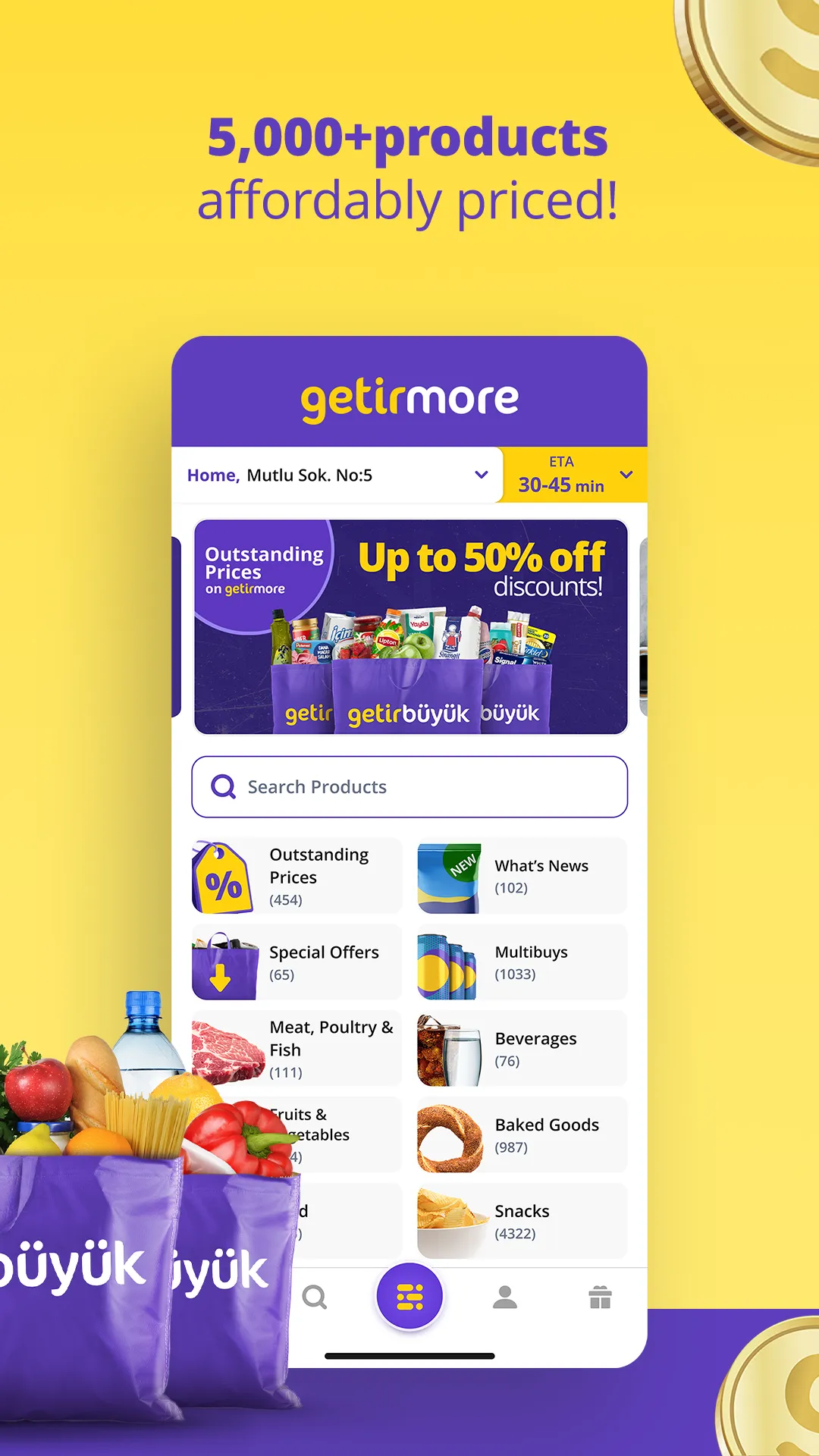 Experience unparalleled convenience with Getir. Getir delivers your daily essentials - fresh ingredients, delightful restaurant meals, and even that last-minute birthday card - directly to your doorstep in minutes. Plus, say goodbye to waiting in line for a taxi. With thousands of services available at your fingertips, Getir frees up your time and takes care of the errands, making life simpler. Discover thousands of products instantly with Getir, spanning categories like Snacks, Water & Beverages, Ice Cream, Baked Goods, Home Care, Personal Care, and Pet Products. Getir, Turkey's premier delivery app, caters to your immediate needs. Say goodbye to trips to the store; let the store come to you! Experience effortless shopping with GetirMore! Browse thousands of products from diverse categories without the need to step foot in a store. Our couriers will deliver everything right to your door! From electronics to automotive supplies, sports gear, and beyond, enjoy a wide selection of products backed by n11 quality. Say goodbye to grocery runs, simply place your order and let GetirMore take care of the rest! ...