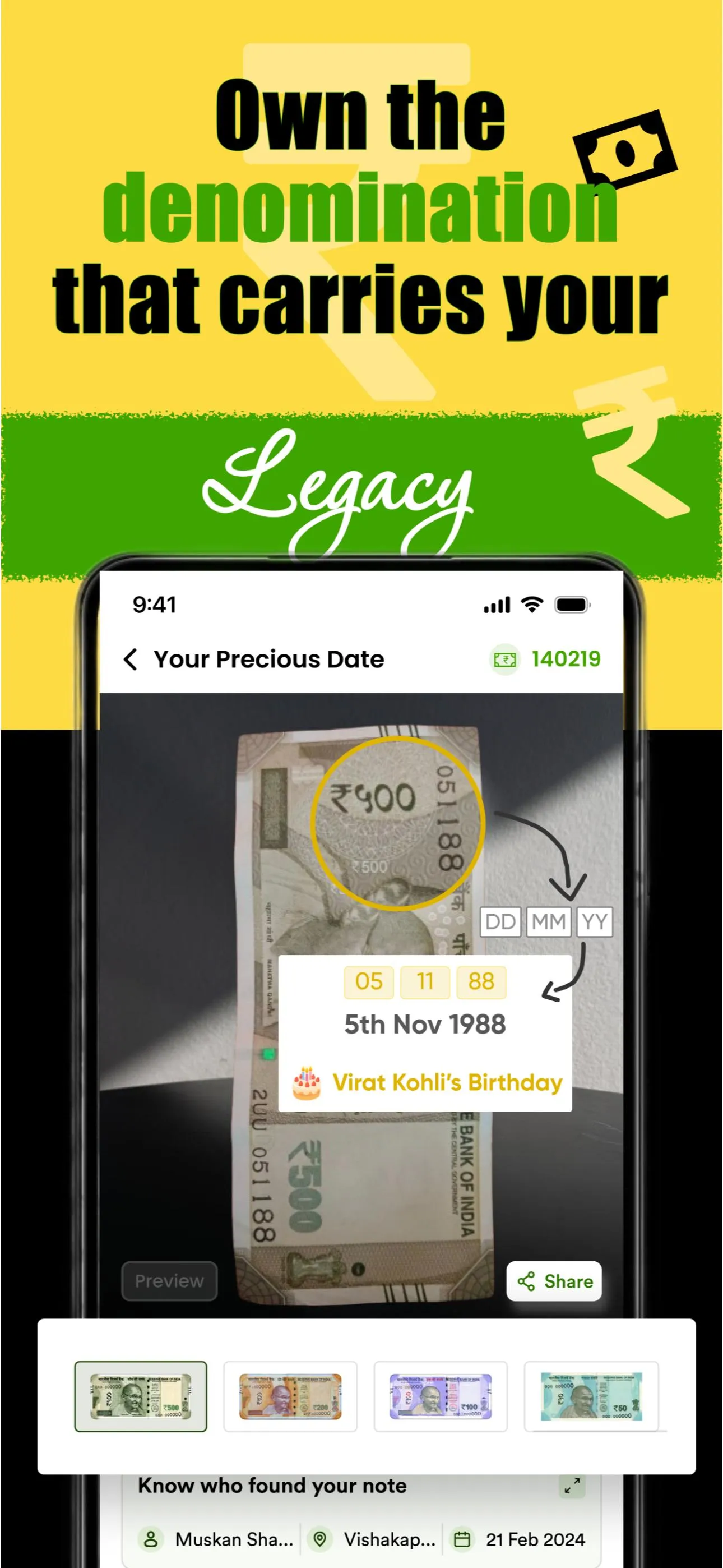 wow amazing app. this is the best platform for Sellers. I sell my 2 notes . one 100 rs and 500 rs. And I am also buying my own Date of birth note. This is a very unique gifting option. I mean it's difficult to find out myself my date of birth note and that platform who provide me my note easily and I feel I have a treasure. ...
