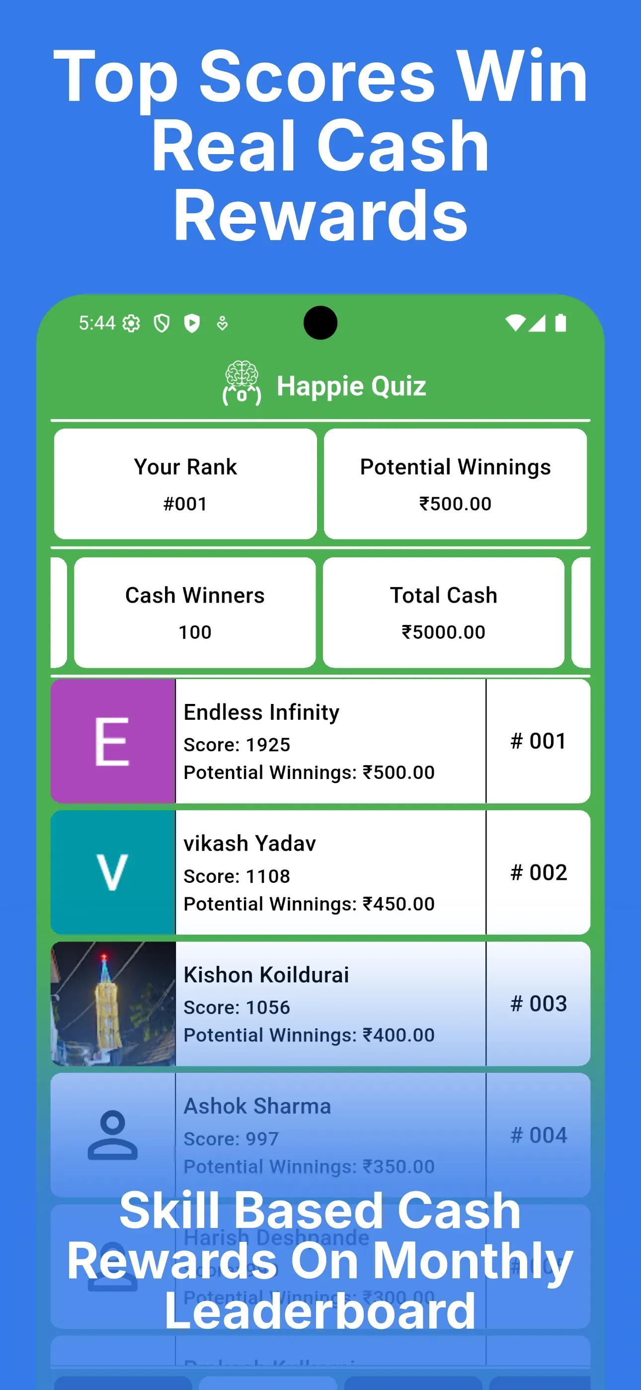 Happie Quiz is a fun, fast, and engaging trivia and general knowledge quiz game where you can train your brain, improve your knowledge, compete with players worldwide, and win cash reward opportunities based on your performance. If you enjoy GK quizzes, brain games, word puzzles, math challenges, and competitive leaderboards, Happie Quiz gives you the perfect mix of learning, competition, and achievement. Answer questions, earn score for every correct answer, climb the global leaderboard. ...